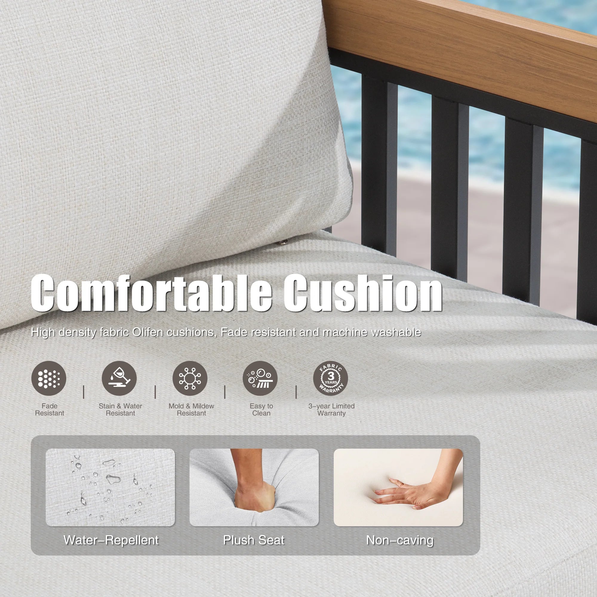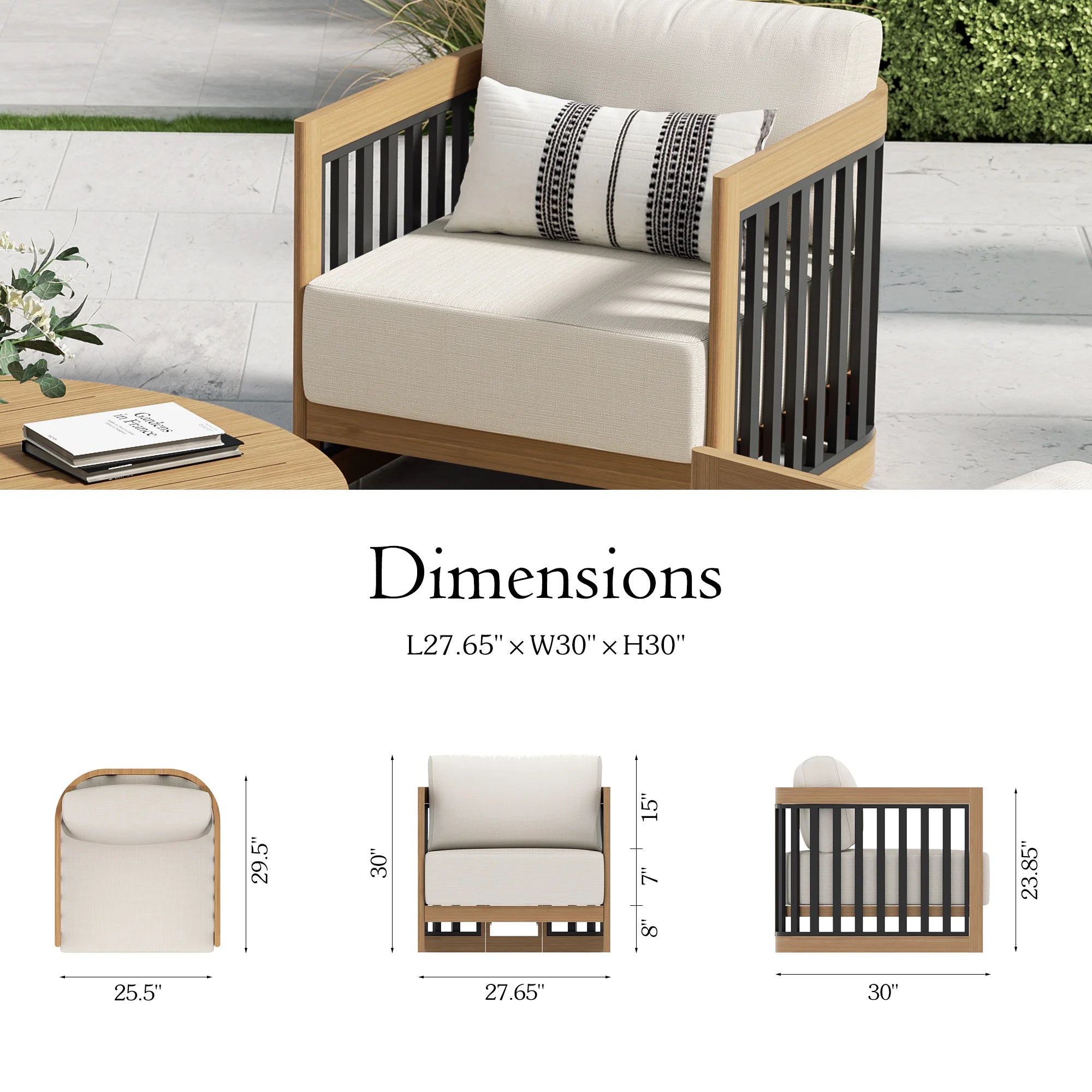 Elevate your outdoor living experience with our premium patio club lounge chair. Constructed with a powder-coated aluminum frame, this chair offers exceptional durability, rust resistance, and minimal maintenance for long-term use. The cushions are upholstered in high-quality olefin fabric, featuring zippered and removable covers for convenient cleaning and long-lasting performance in various weather conditions. Designed with comfort in mind, the chair includes 7-inch thick seat cushions that provide excellent support, along with plush back cushions for enhanced relaxation. Aesthetically, the chair showcases a refined silhouette with black vertical side slats and is available in two sophisticated frame finishes: hand-brushed smoke gray or heat-transferred teak. Combining luxury with functionality, this lounge chair is an ideal addition to any upscale outdoor setting.