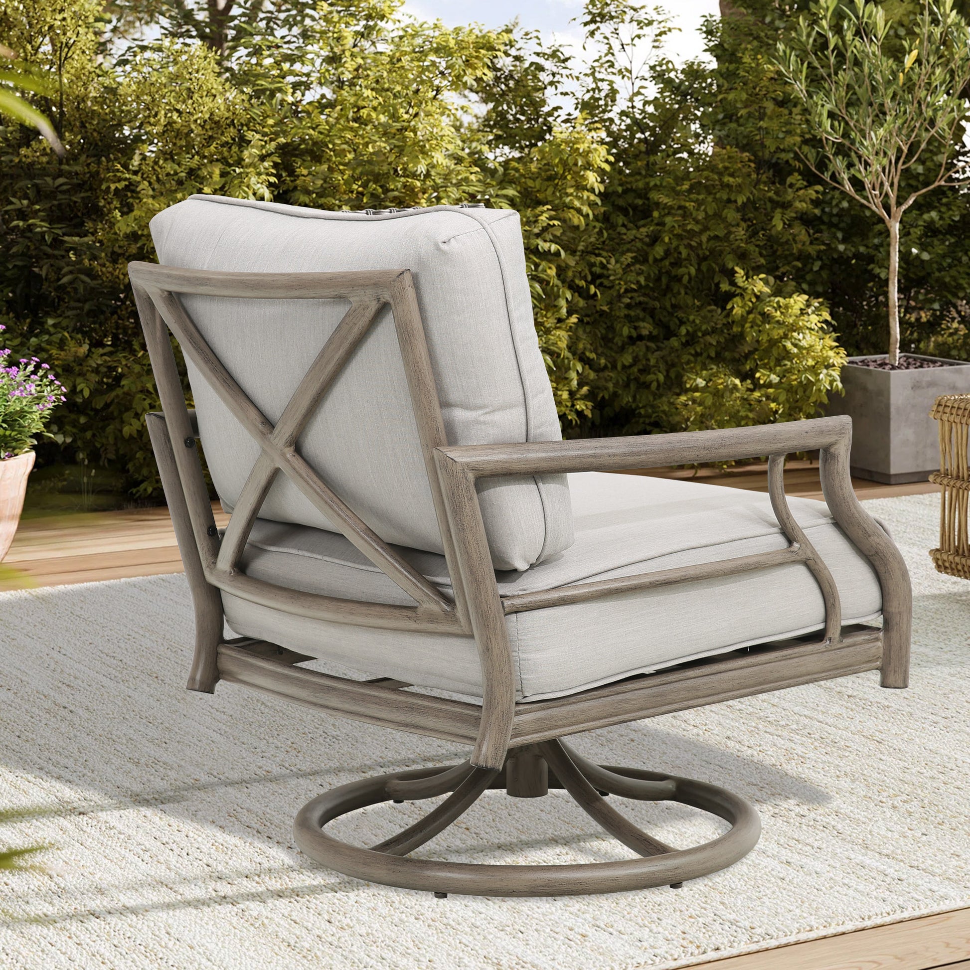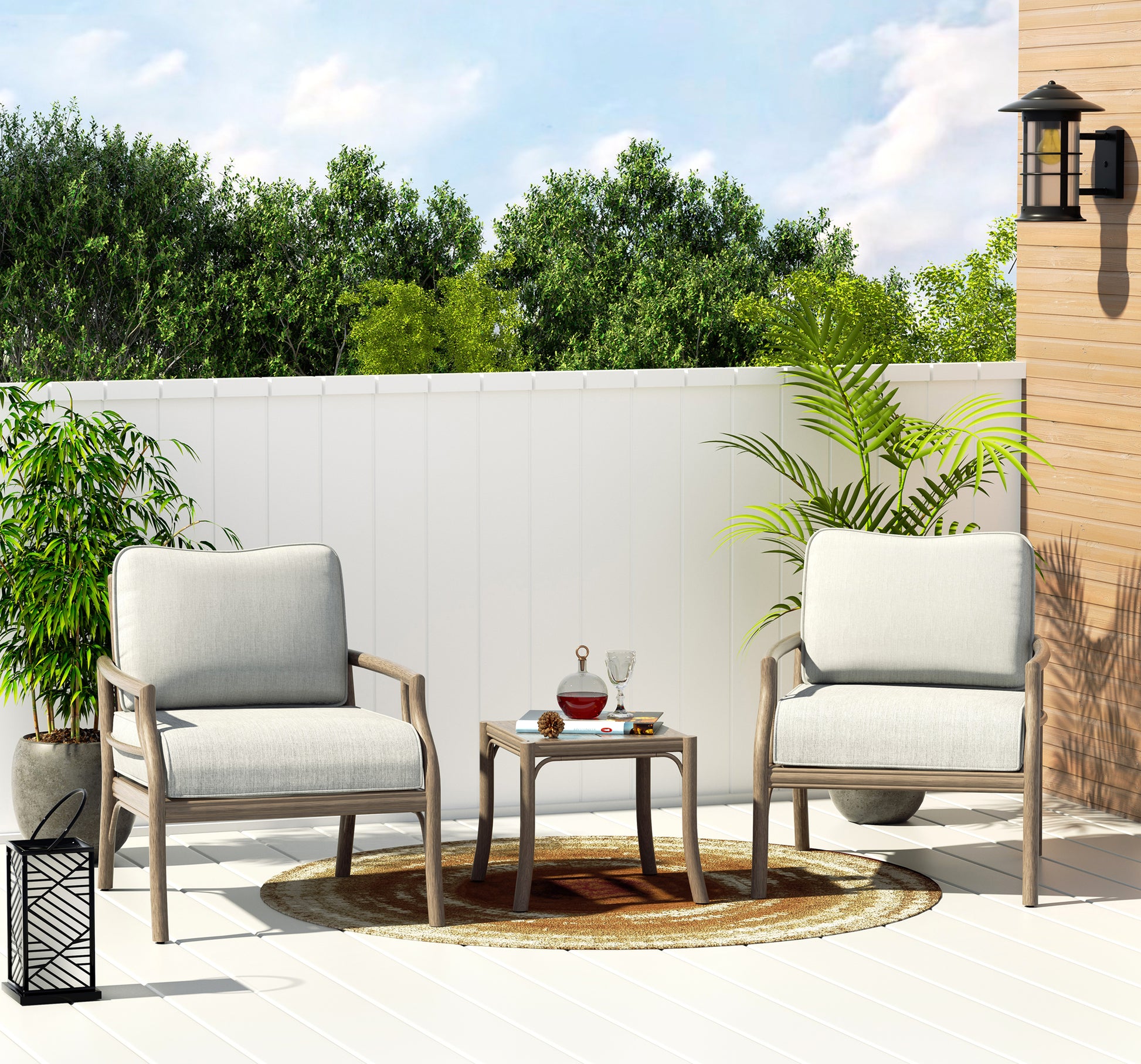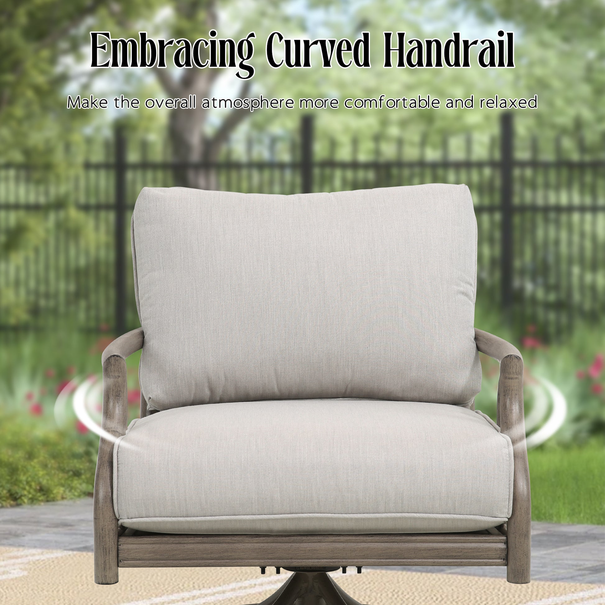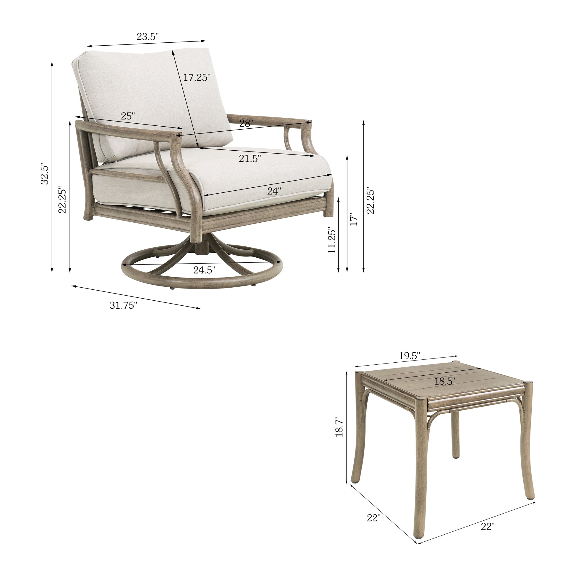 Presenting the versatile Lamando 3-Piece Aluminum Patio Conversation Set, complete with an end table and 2-swivel chairs, adaptable to various outdoor settings such as gardens, terraces, balconies, or poolside lounging. Built with robust construction, these chairs ensure stability and long-lasting durability, promising years of enjoyment. Sink into relaxation with the plush back cushion offering enhanced lumbar support, while the ergonomically designed seat cushion ensures comfort during extended lounging sessions. The imitation wood hand brush painting adds a contemporary touch of sophistication, seamlessly blending modernity with timeless beauty. With its enduring color palette, intricate design, and premium materials, this set becomes a cherished investment for your outdoor sanctuary. Say goodbye to rust worries with our upgraded aluminum construction, backed by a generous 3-year warranty. Embrace the natural style, harmonizing with the environment, providing a serene and comfortable outdoor experience. Light assembly required.