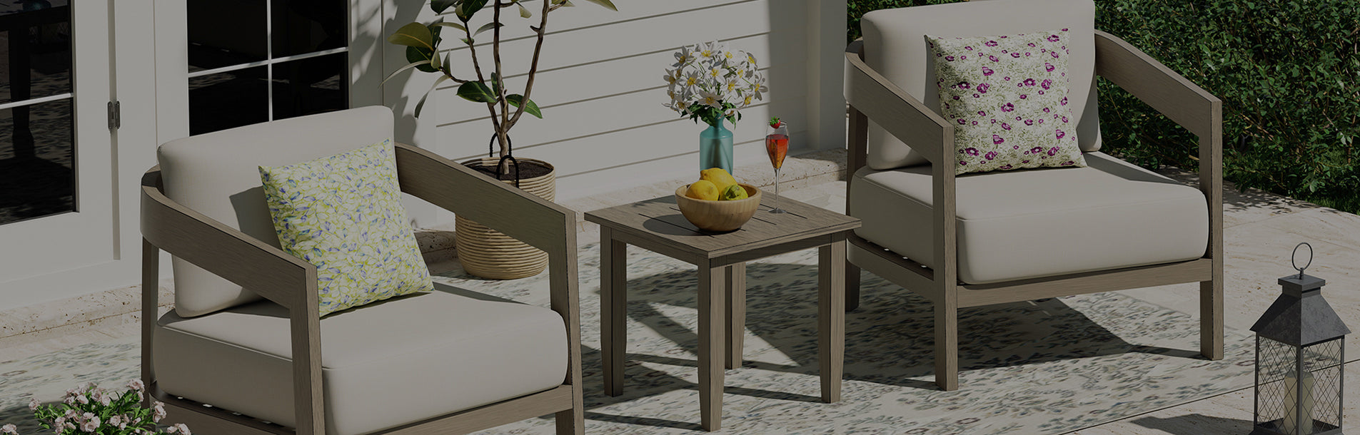 For the cushions, we recommend removing the covers and machine washing them with a mild detergent on a cold cycle, or spot cleaning with mild soapy water and a soft brush. Cushion fabrics (such as Sunbrella® material) have waterproof, sun-resistant, and quick-drying properties, but we suggest checking and drying them after extreme weather to prevent mold or water buildup.