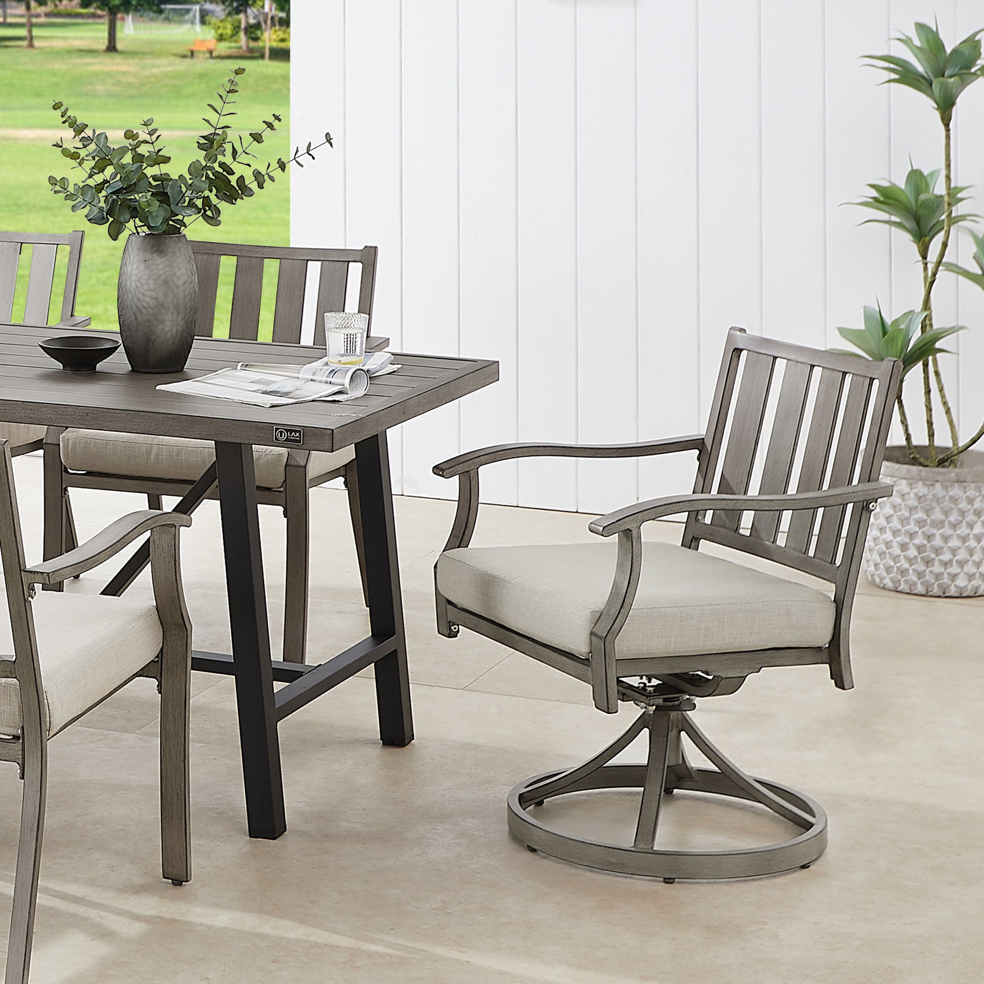 Create a relaxing space in your living space with this practical and elegant aluminum Azur swivel dining chairs. These chairs are made of premium aluminum frames with paint finish, rustproof and sturdy for long-term use. The seats are designed with a 360-degree swivel function for easy communication and extra fun, and ergonomic wide armrests and seats provide you with extraordinary comfort. In particular, the dining chairs are equipped with Sunbrella fabric cushion covers, which are ideal for outdoor furniture, breathable, stain-resistant, and have strong fading resistance. These swivel dining chairs offer you luxurious comfort so you can enjoy the outdoor life in style while its durable build will keep it looking like new for years to come.