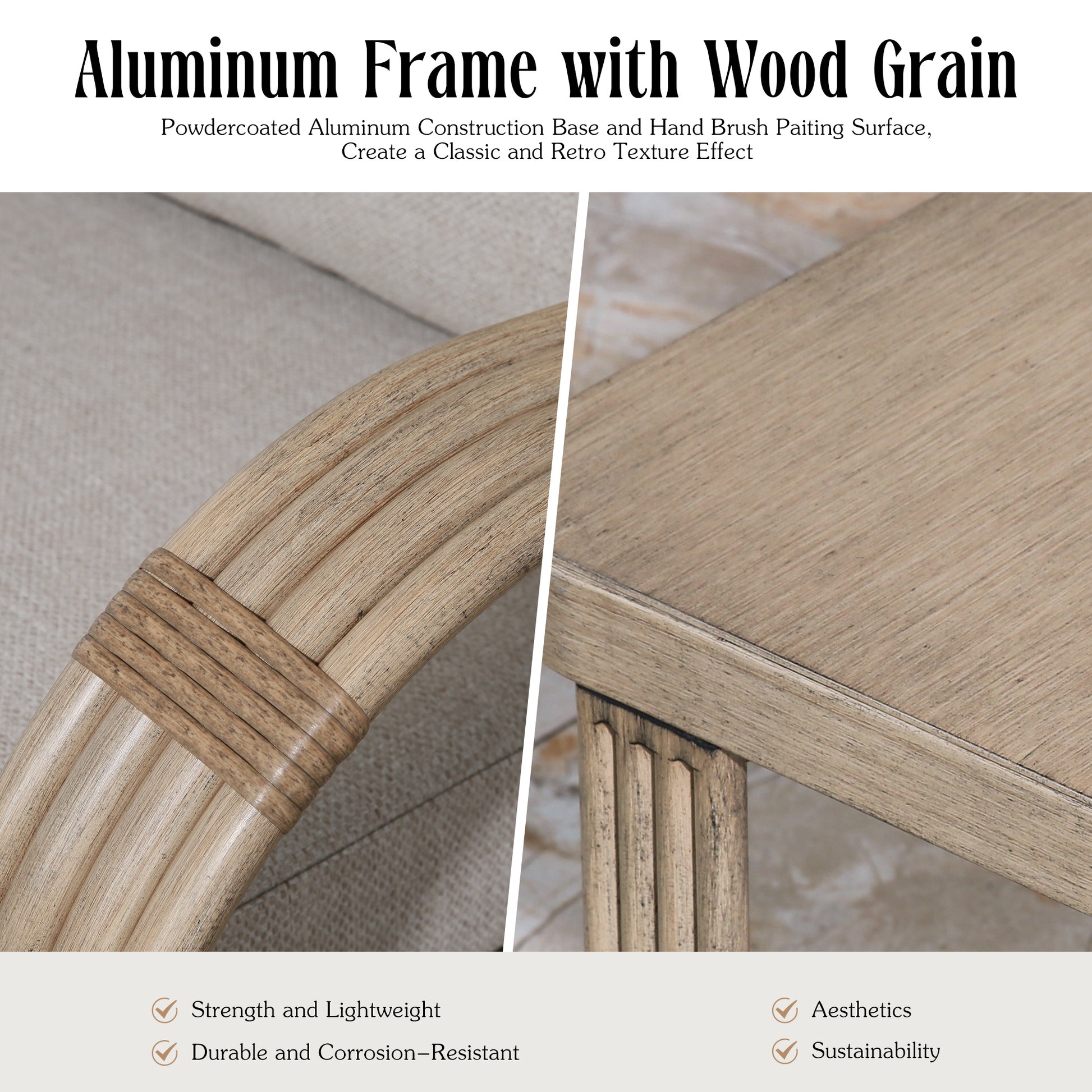 - This frame is made of rust-free aluminum that has hand-brushed texture with distressed natural character.