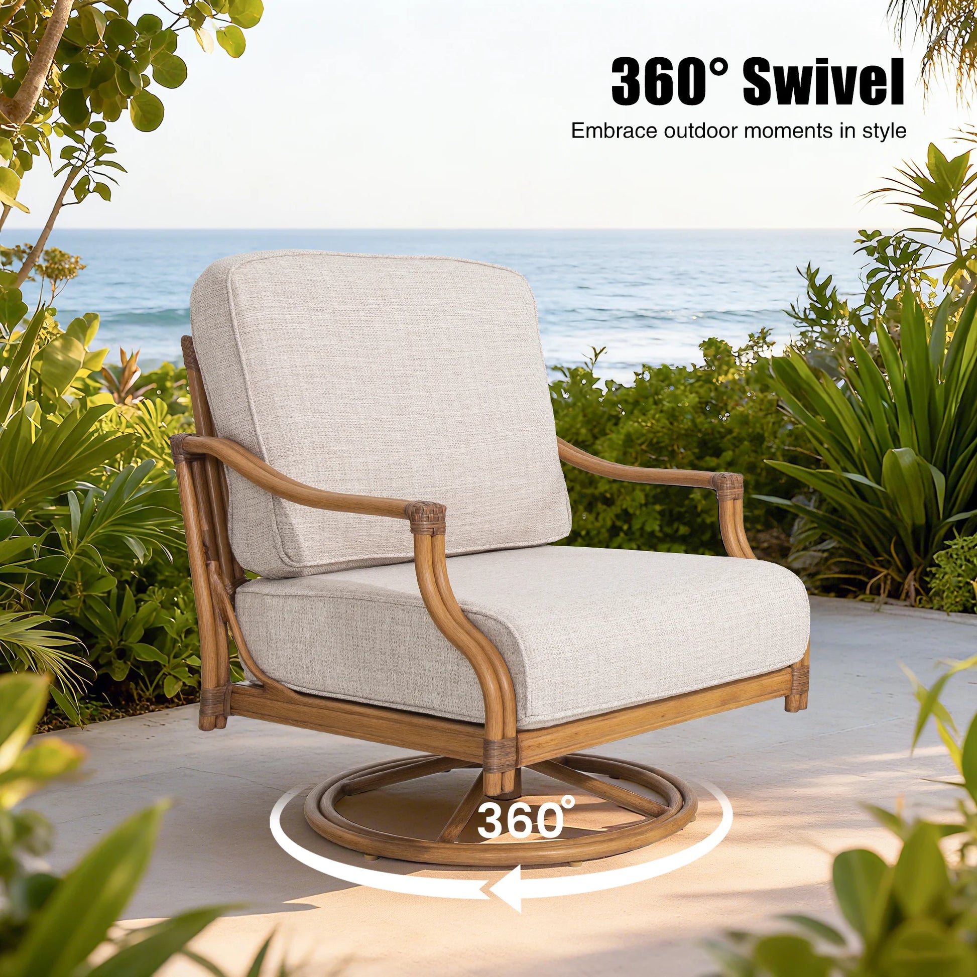 Discover the perfect blend of modern resilience and relaxed style with our 360° Swivel Patio Club Chair. Its core strength comes from a lightweight yet robust powder-coated aluminum frame, offering superior rust and corrosion resistance while featuring an elegant wood-grain finish for a warm, natural look. Subtle accents of hand-woven PE wicker add a touch of texture without compromising the sleek, contemporary design. Enjoy effortless flexibility with the smooth 360-degree swivel base, adjustable leveling feet for stability on any surface, and deep, comfortable cushions upholstered in high-quality SDSP fabric. The removable, machine-washable cushion covers make maintenance a breeze, ensuring your outdoor oasis remains stylish and care-free.