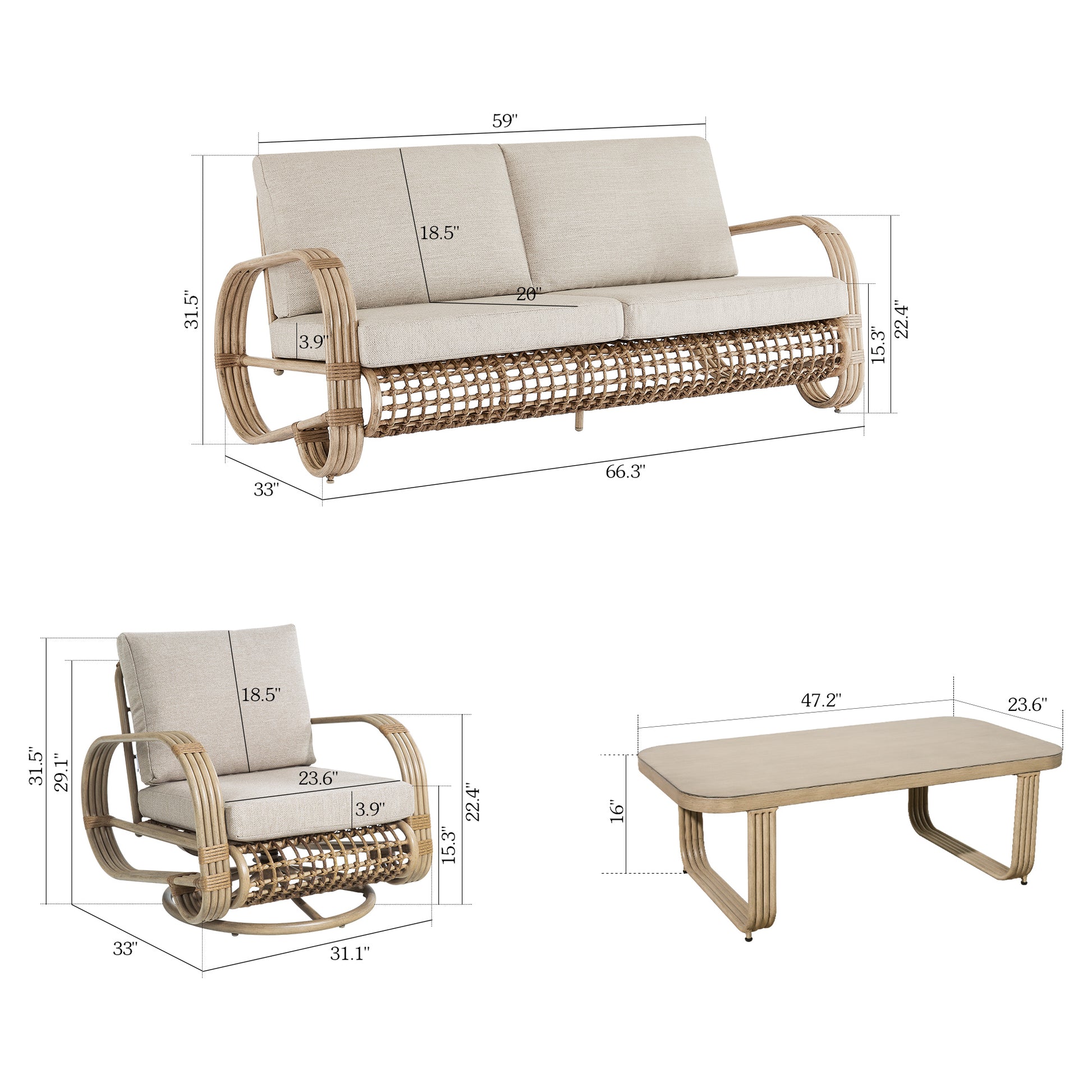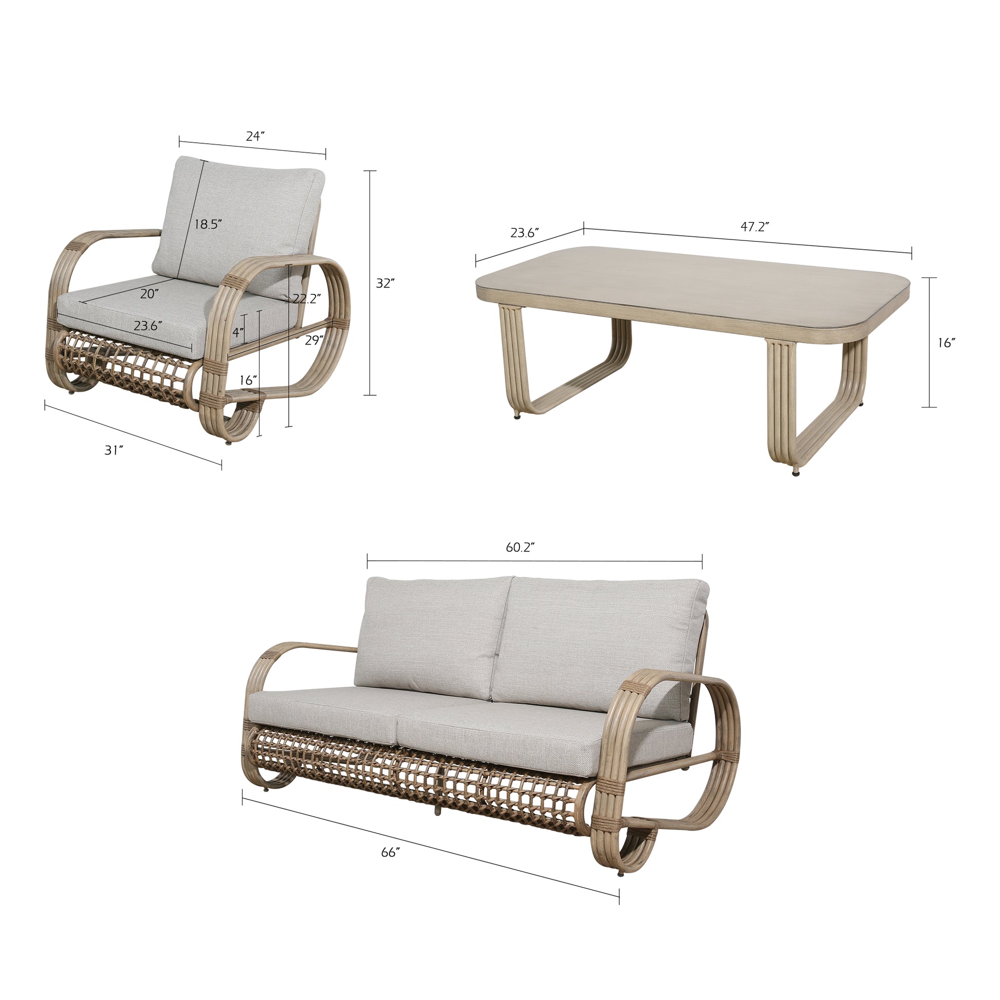 - Overall Dimensions: loveseat: 66(L) X 29.1(W) X 31.9(H), single club chair: 31(L) X 29.1(W) X 31.9(H), coffee table: 47.2(L) X 23.6(W) X 16(H). Simple assembly required.