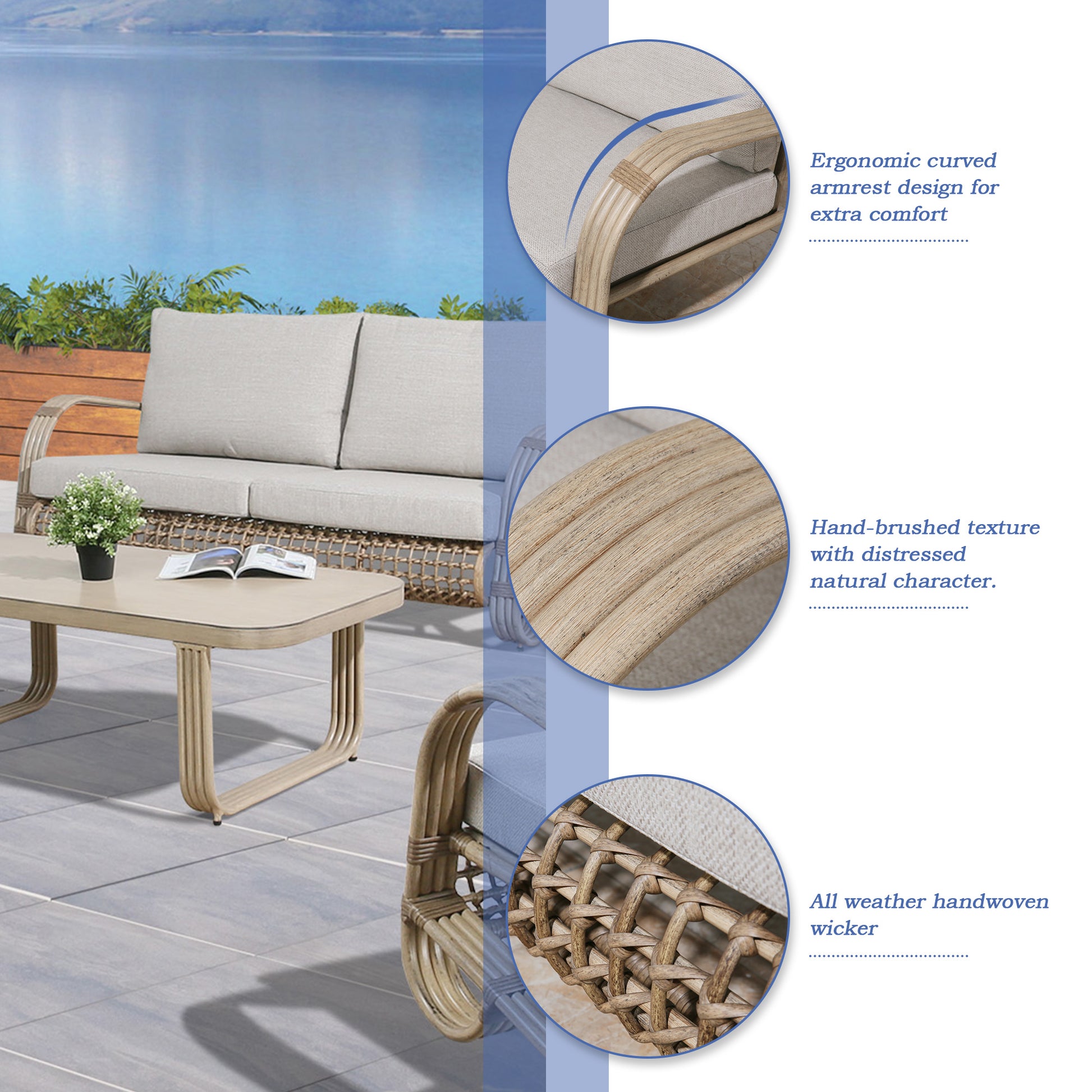 - Premium Material: Constructed of hand-brushed textured aluminum wrapped in high-quality handwoven wicker, the patio furniture set is weather resistant,rust-free and durable. No edges and corners, safe for children.
