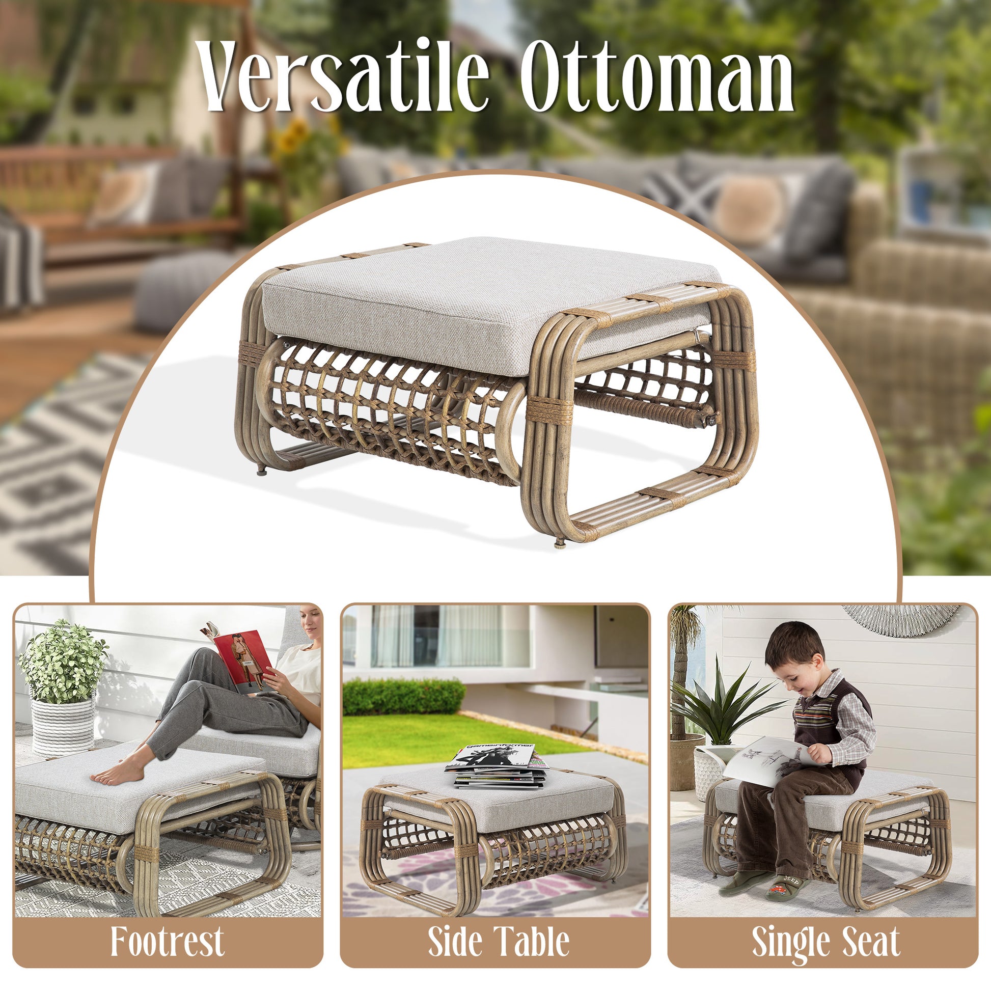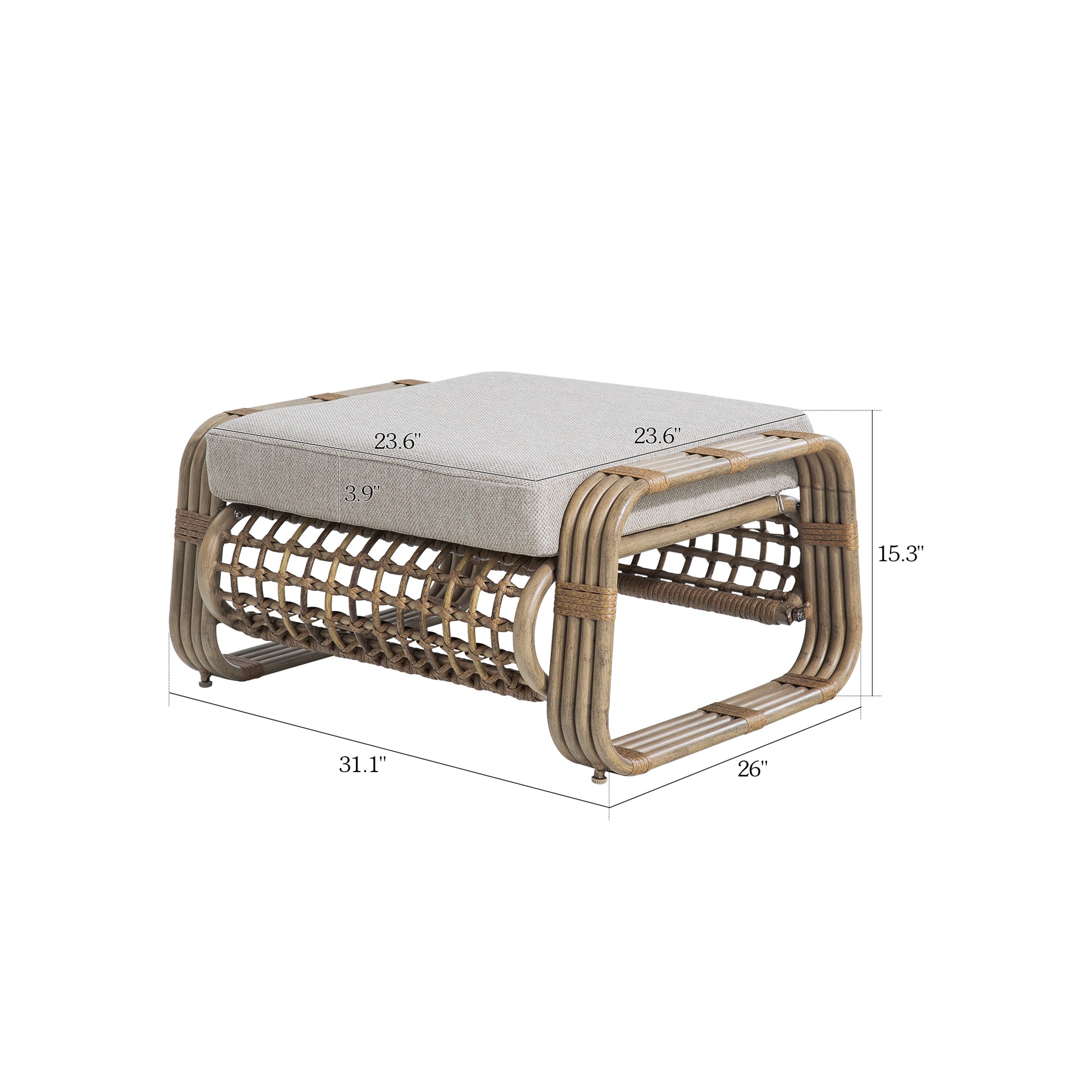 This classic and stylish ottoman consists of rust-resistant and powder-coated aluminum frame and all weather PE wicker to ensure durability and resistance to outdoor elements. The Olefin cushion is generously padded, ensuring a comfortable and enjoyable experience when you use it. Moreover, the cushion covers feature a zipper design, allowing for easy removal and convenient cleaning.