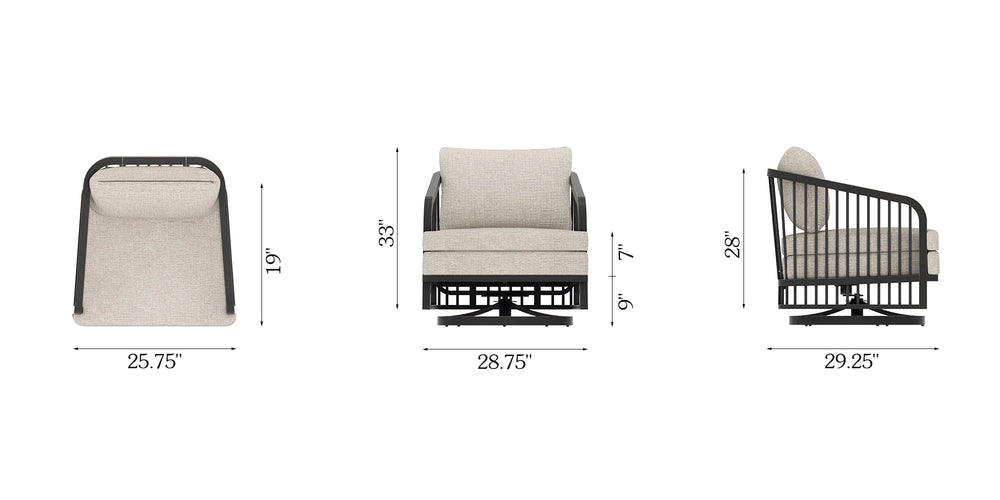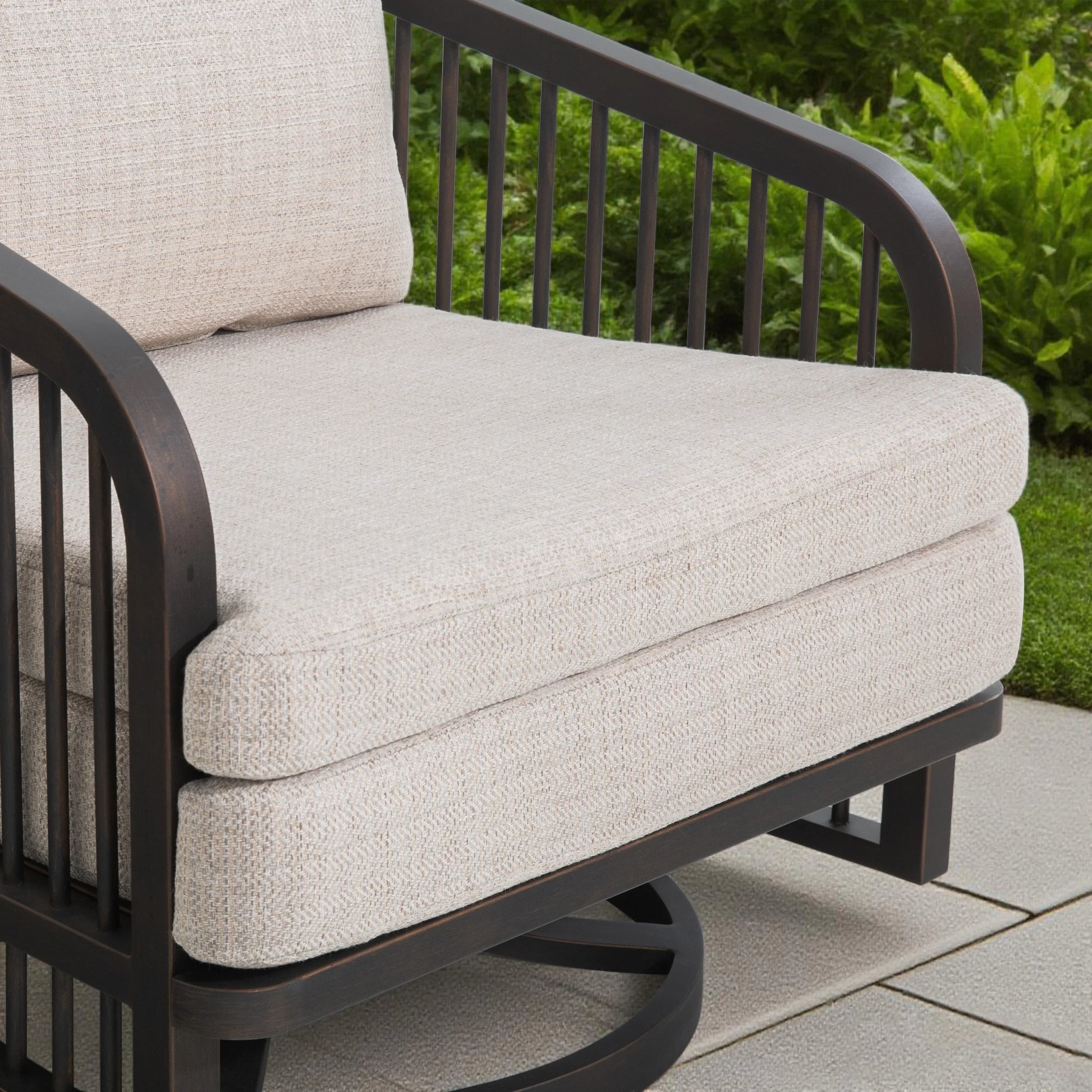 Elevate your outdoor living with our elegant Swivel Club Chair. Enjoy 360-degree rotation for flexible seating and effortless conversation. The frame is crafted from rust-proof, weather-resistant aluminum with a hand-applied bronze powder coat, offering both durability and sophisticated style. It is designed with a uniquely double-layered cushion in performance olefin fabric—fade-resistant, breathable, and made for the outdoors. The zip-off cover ensures easy maintenance. Perfect for patios, balconies, or by the pool.