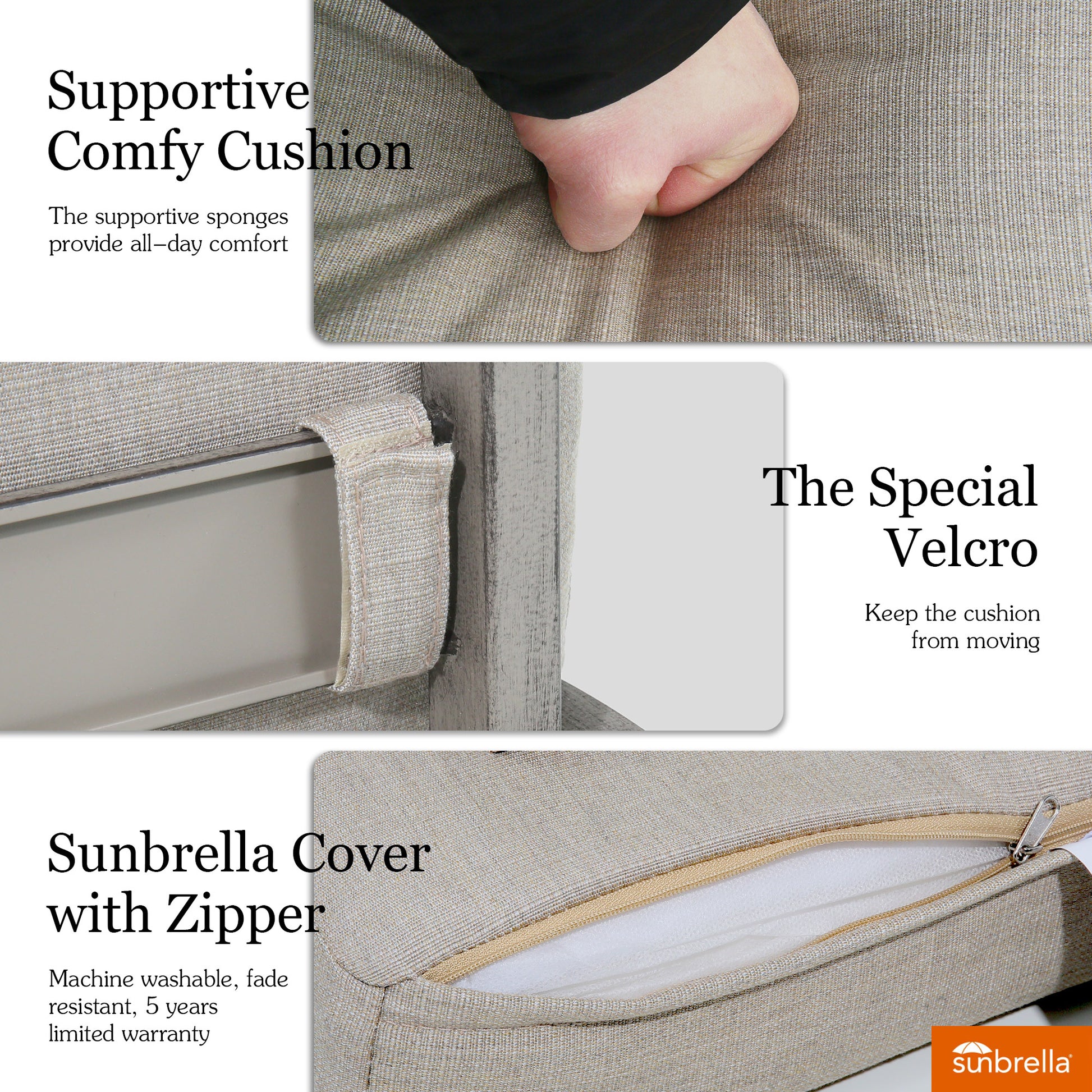 - Sunbrella cushions: Sunbrella fabric is designed to weather the outdoor elements and resist stains, spills, fading, and mildew. Cushions are filled with thick and high-resilience sponges for ultimate comfort.