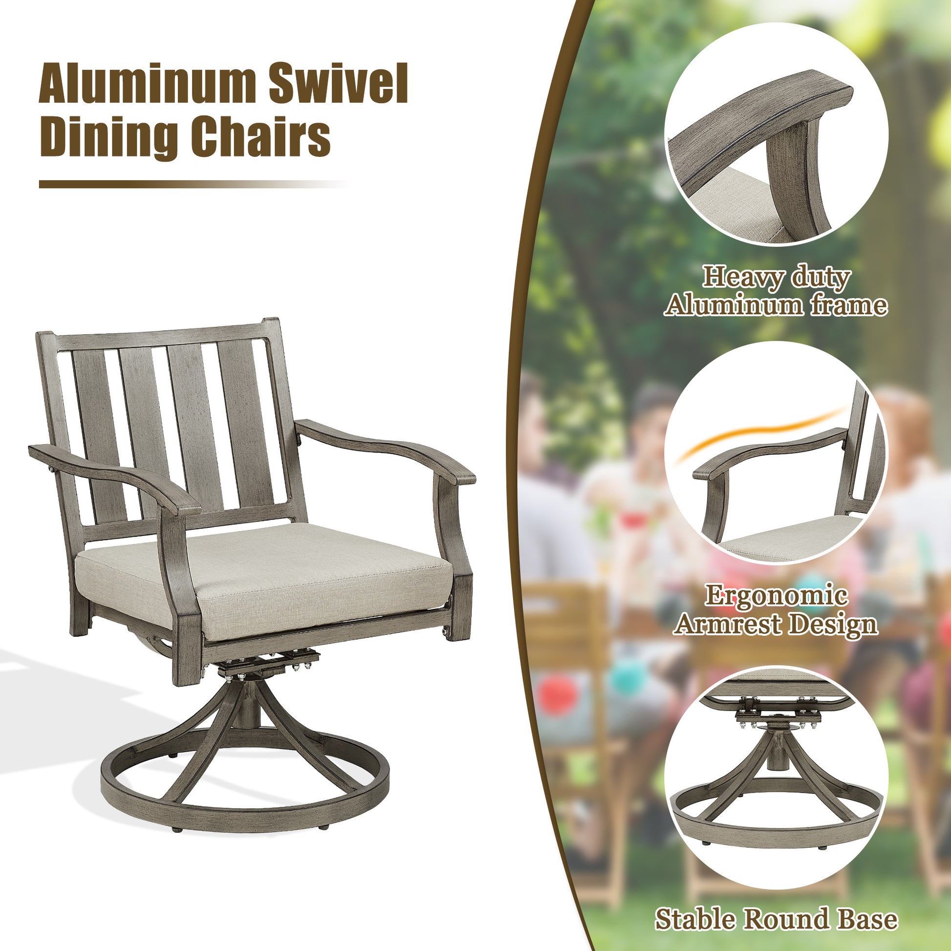 This 8 person Aluminum dining set includes a square dining table with an 1.96” umbrella hole, four armchairs, and 2 benches, giving you the means to create an oasis of comfort in your outdoor space. The color of this set is a beautiful brushed gray, it is sturdy, and a nice size. The chairs and bench are wide and the cushions are comfortable. its durable build will keep this set looking like new for years to come. What's Included? 6 Cushions Included 2 Bench 1 Table 4 Chair Features The table is made of powder coated steel frame and Aluminum tabletop, weather resistant for long term use. Equipped with a 1.96” umbrella hole to facilitate your outdoor activities. Chairs and bench are made of aluminum. Sunbrella cushions are filled with thick and high resilience sponges for ultimate comfort. This set is lightweight and easy to move around, but still heavy enough not to blow over with the wind.