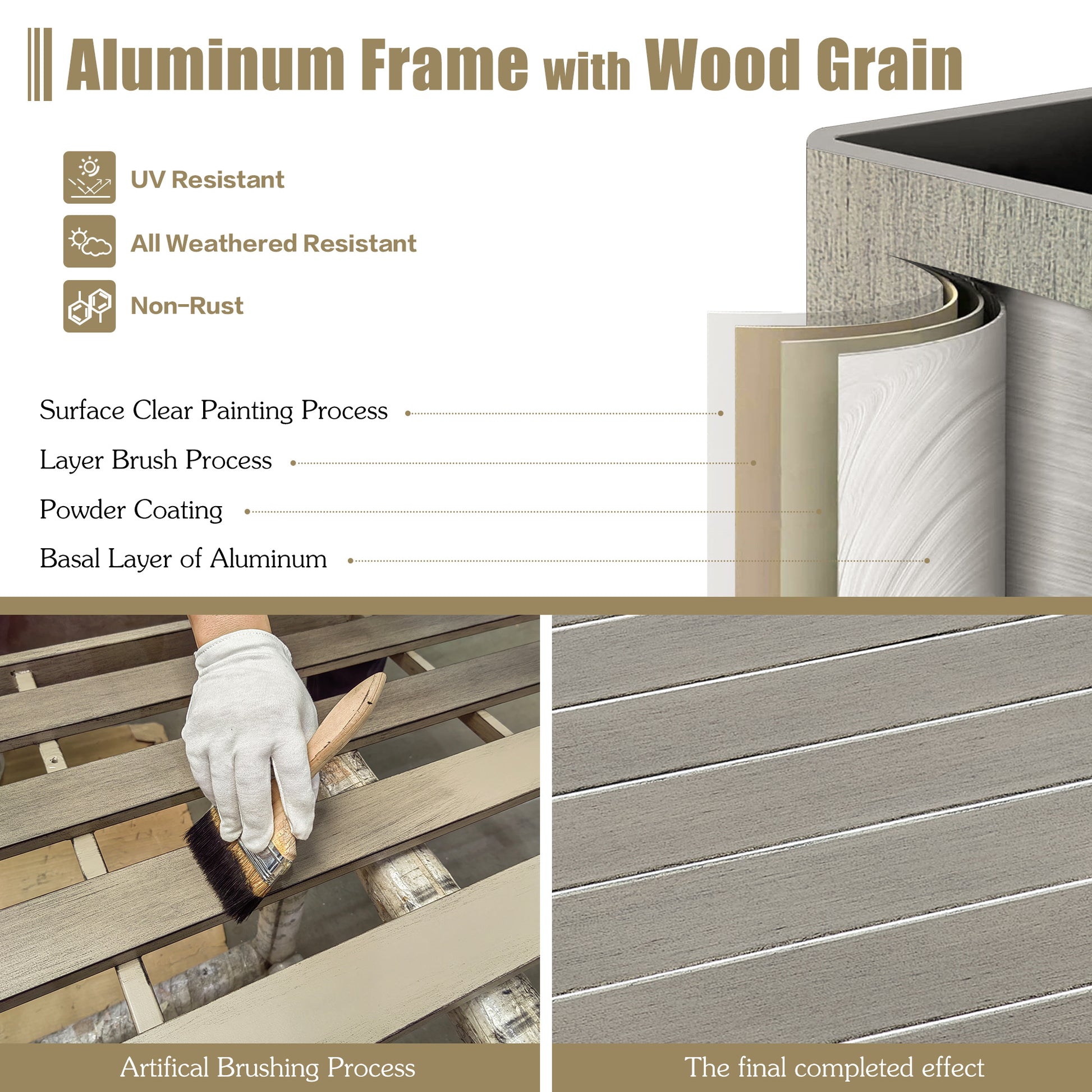 - Slatted aluminum tabletop with paint finish, presenting a unique hand-brushed texture with distressed natural character.