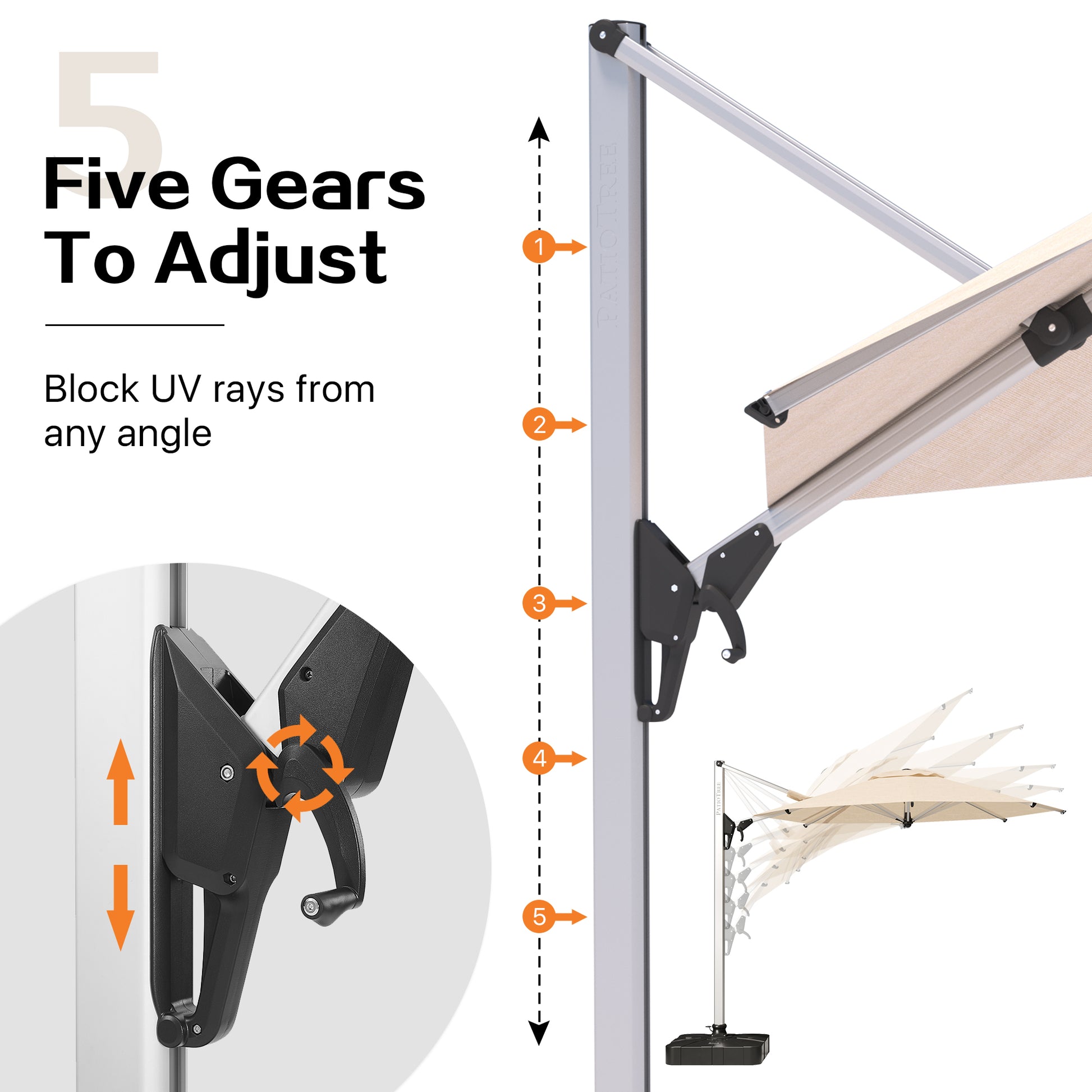 ✅ 360° Swivel Crank & Tilt System: Effortlessly adjust shade angles with the ergonomic sliding handle. Rotate the canopy 360 degrees or tilt the mast to 5 positions for precise sun blocking.