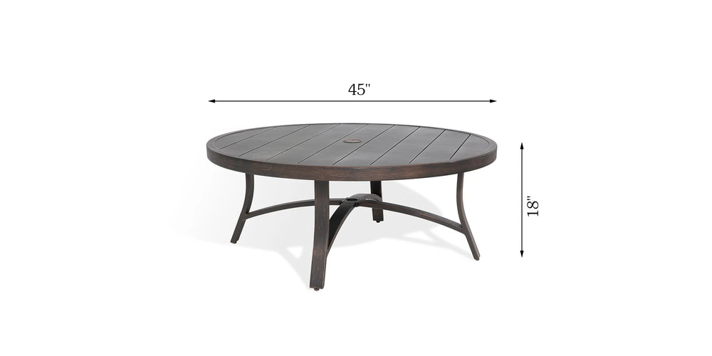 - Slatted tabletop: The round slatted tabletop provides a chic yet hard surface for placing snacks, drinks, decor, etc. Equipped with a 2.1” umbrella hole to facilitate your outdoor activities. Easy to clean and maintain