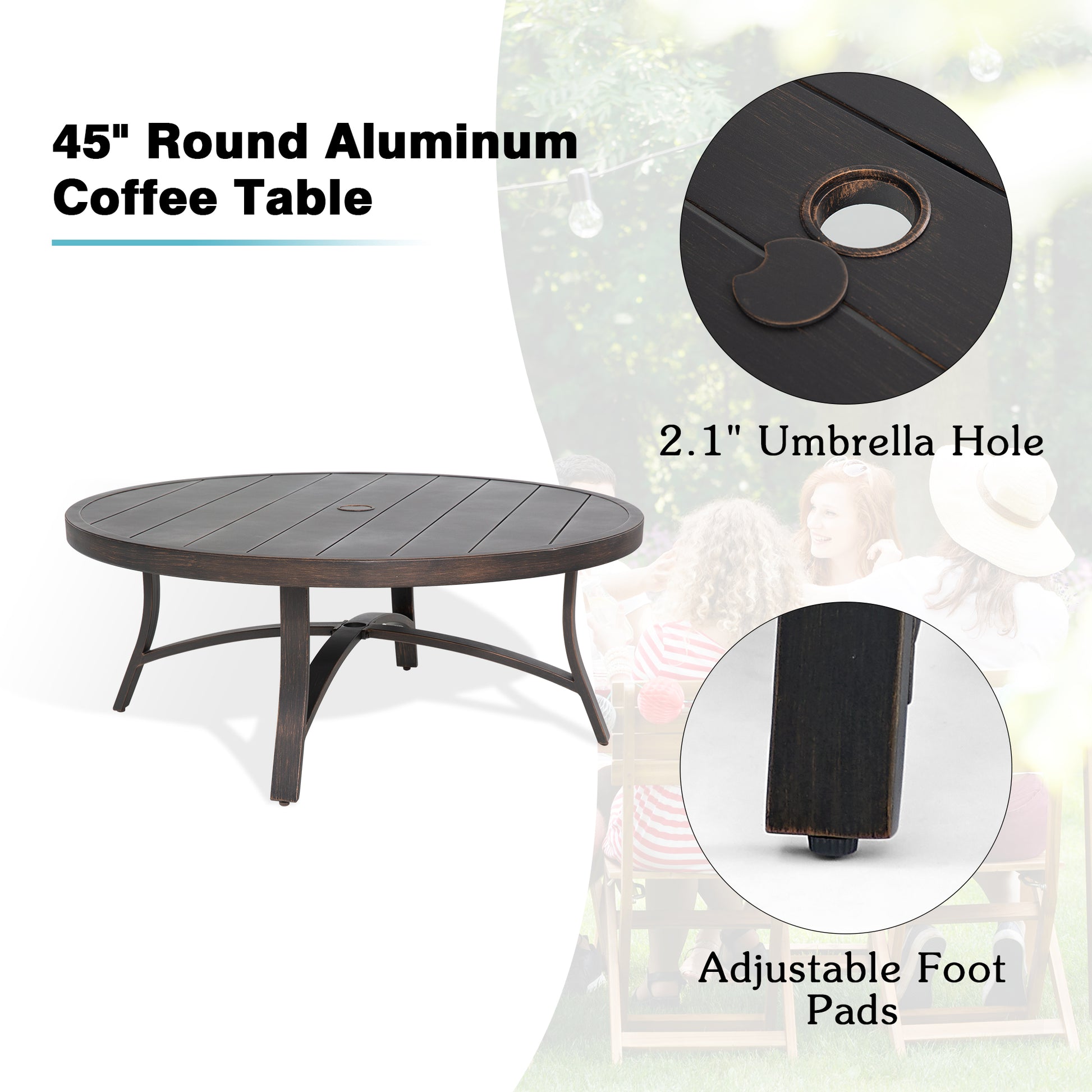 Our premium outdoor conversation set, the perfect ensemble for your outdoor living space! This luxurious set includes 2 club chairs, a 3-seat sofa, a coffee table and Sunbrella cushions. This set is made of rustproof and durable aluminum frame with bronze finished to create a unique brushed texture. And an ergonomic wide armrests and seat provide you extraordinary comfort. In particular, the cushion covers are made of Sunbrella fabrics, which is ideal for outdoor furniture, breathable, stain resistant and have strong fading resistance. The round coffee table is 45 inches in diameter and provides plenty of space for food, drinks, and other items. A 2.1-inch umbrella hole in the middle of the coffee table allows you to add shade to your space. The open design style of the conversation set makes it easy to match with other furniture, while being suitable for both indoor and outdoor use, creating a chic yet cozy place for your life.