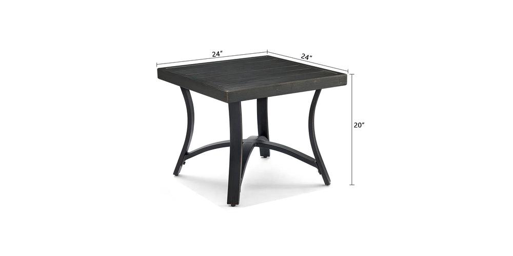 The patio square side table made of premium aluminum materials with hand brush paint finish ensure it is weather resistant, rustproof and durable enough for years of enjoyment. Bottom are connected with a half arc cross design for maximum stability under a durable, slatted textured table top, fusing durability with an eye-catching look. This classical square end table can serve as a modest yet elegant addition in your living room, garden, yard and balcony for placing beverages, snacks, decor etc.