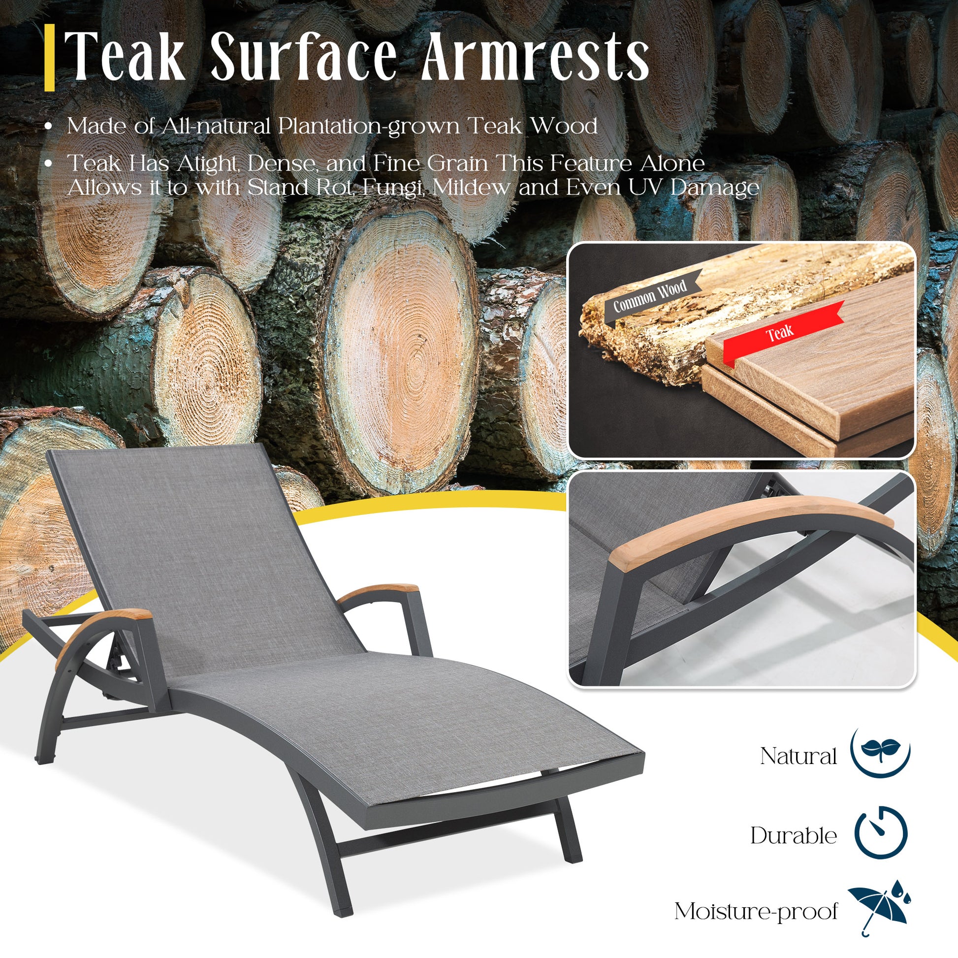 - Teak armrests: Teak is dense and fine-grained, resistant to mold and UV rays, adding a touch of elegance to your outdoor space while being environmentally friendly. Its bright colors add vitality to the whole chaise lounge chair.