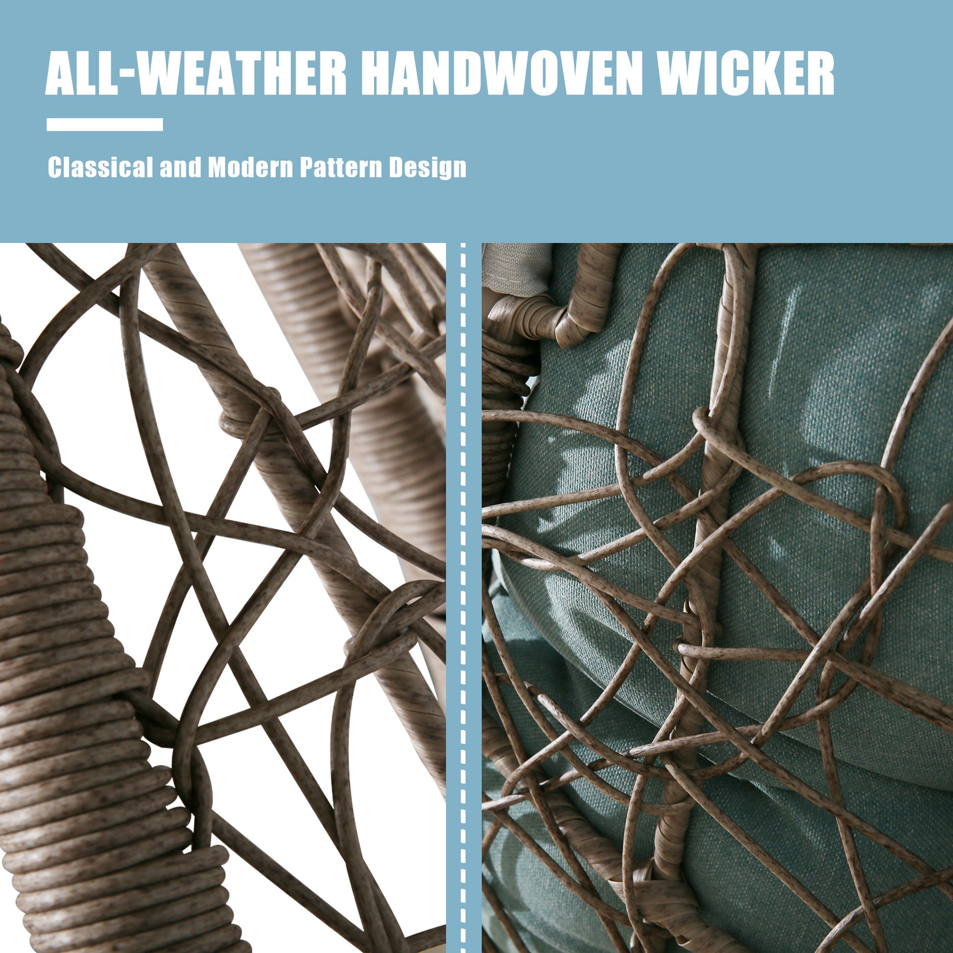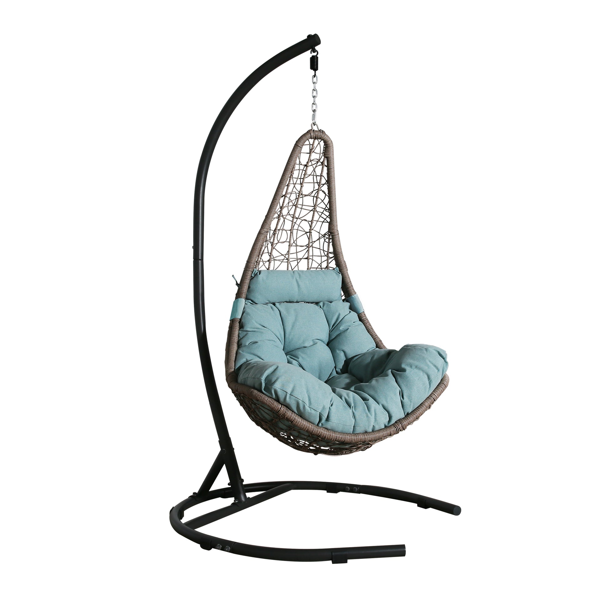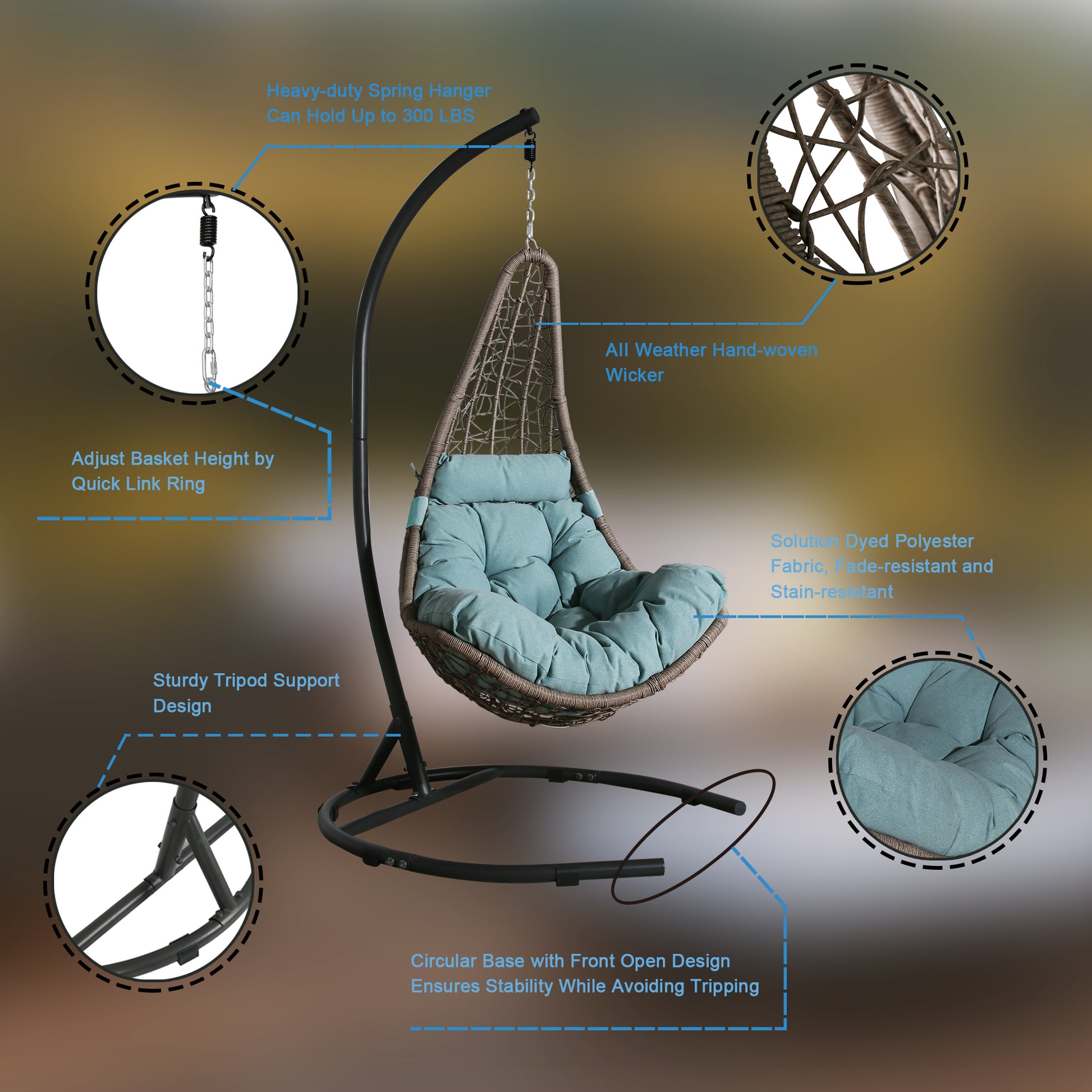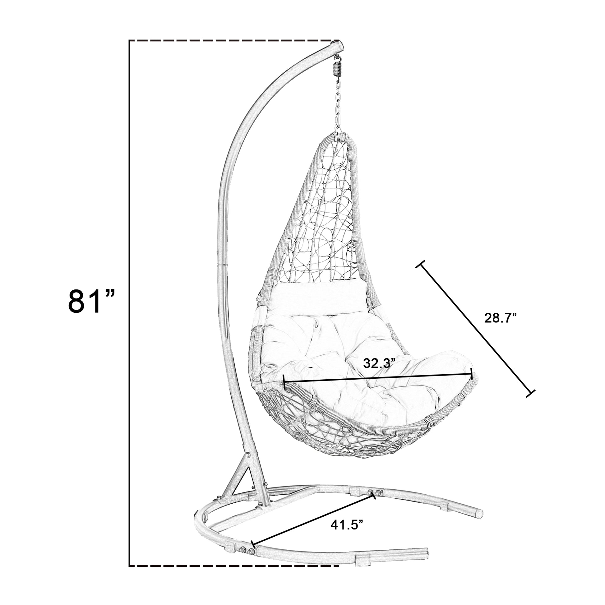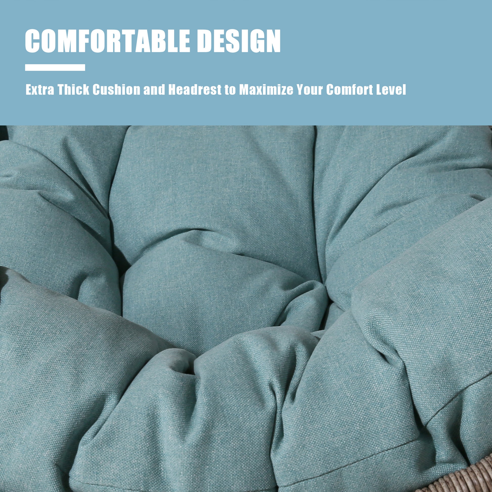 Featuring a graceful moon shape, this swing chair encapsulates you in its cozy structure, giving you maximum comfort to lounge about. Extra thick cushion is available in two colors: Beige and Blue, provides you the ultimate comfort and classic colors never go out of style. This swing chair is finished with an intricate weave design, this style is not only incredibly durable but also provides a versatile appearance. The craftsmanship details of this material allow this piece to blend seamlessly with your patio, poolside, garden, porch, balcony, backyard, deck and indoor decor.