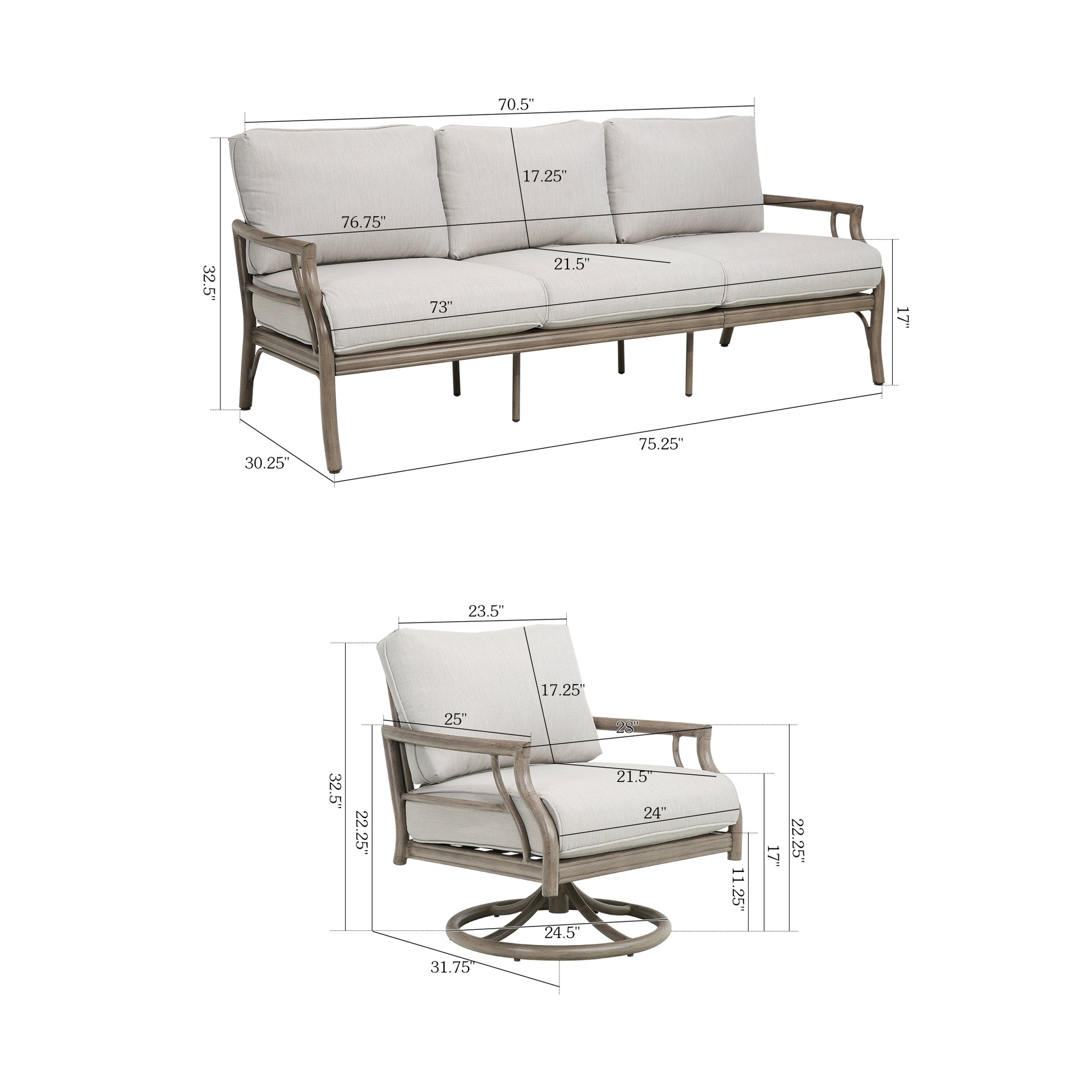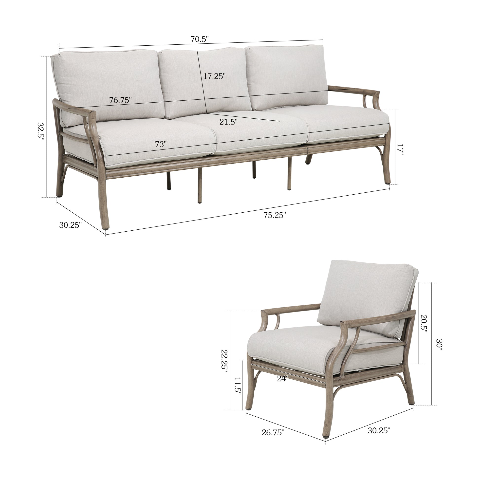 Lamando 3 pieces seating group, is designed to comfortably accommodate up to five people. This set includes a three-seater sofa and two club chairs, all featuring a sturdy aluminum frame with a wood-like texture for durability and minimal maintenance. The seating comes with plush olefin cushions that are both waterproof and machine washable, ensuring both comfort and convenience. The chairs and sofa also boast elegantly curved armrests, adding a touch of sophistication to the overall design. Elevate your outdoor lounging experience with this stylish and functional seating group.