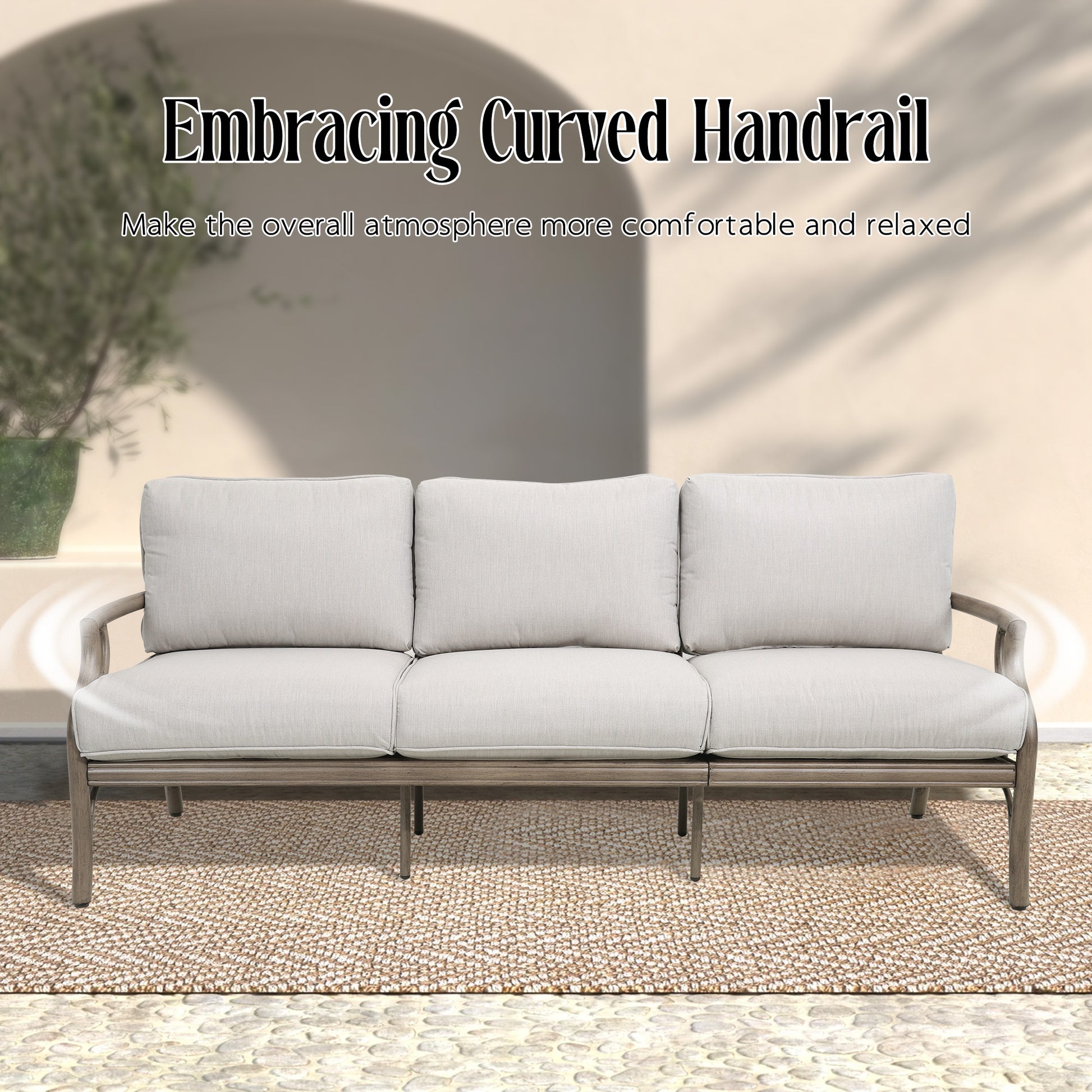 This well-made patio sofa with Olefin cushions, the perfect combination of style and functionality for your outdoor seating needs. Crafted with a wood grain aluminum frame, the aluminum sofa is not only durable but also incredibly easy to maintain. The included Olefin cushions provide a comfortable seating experience while being both water-repellent and machine-washable, making them ideal for outdoor use, and the curved armrests add a touch of elegance. Upgrade your patio furniture with our loveseat and enjoy outdoor relaxation like never before.