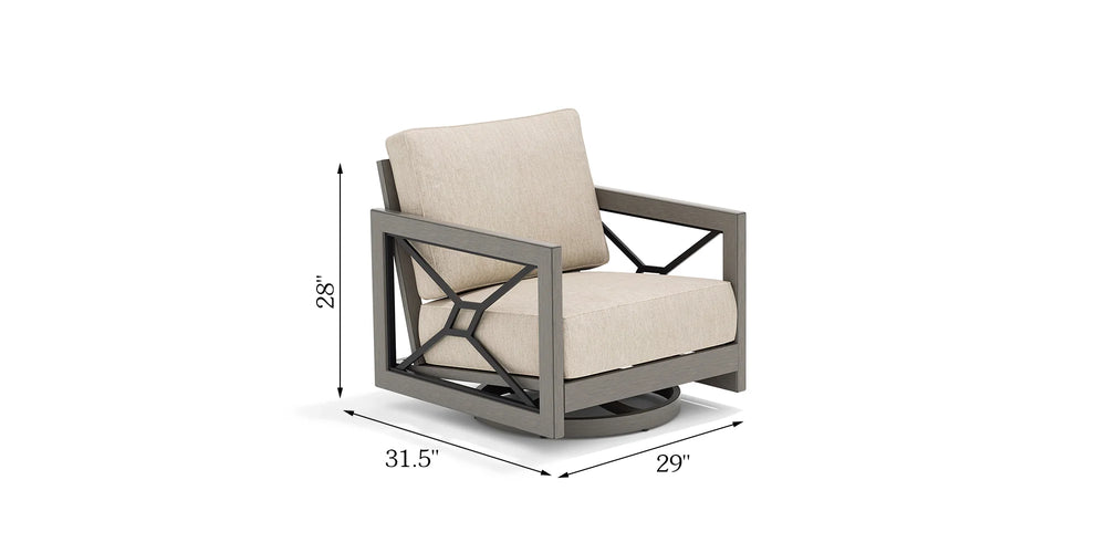 This luxurious and well-made patio 3pcs conversation set includes 2 swivel club chairs and one square side table that will be a stylish addition to your living space. Both the swivel chairs and side table feature a sleek, cold gray aluminum frame with a distinctive cross-cut diamond pattern on sides, and whole set is powder coated for a smooth, beautiful finish that will last for years to come. Plus, the club chairs are equipped with Sunbrella cushion covers, which are breathable, stain-resistant, and have strong fading resistance, making it an ideal choice for outdoor furniture.