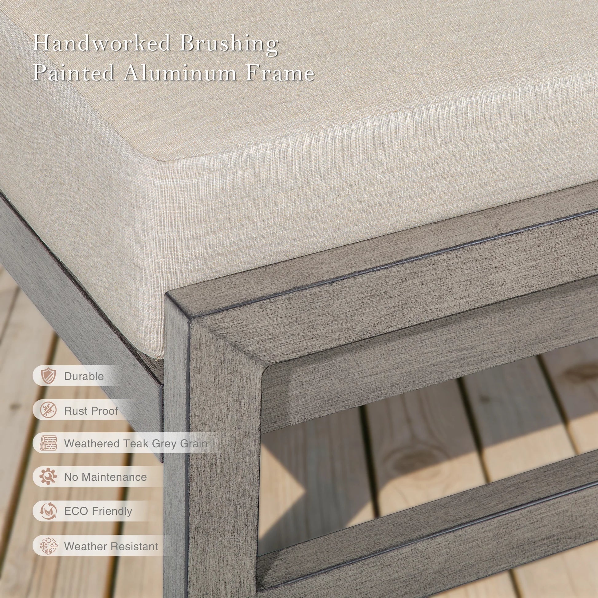 Marindo Ottoman crafted for style and durability. Itshand-brushed weathered teak-grey aluminum frame is rust-proof, low-maintenance, and eco-friendly, built to withstand the elements. The plush 7" Sunbrella cushion (high-density foam, removable/washable) delivers breathable comfort, plus UV-fade and water resistance. Finish it off with an adjustable foot mat for stable, level placement on any patio surface.
