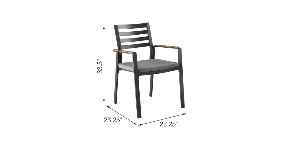 Nuova outdoor dining set seamlessly integrates modern design with practical functionality. The table boasts a robust aluminum frame and an elegant teak top, combining aesthetic appeal with durability to withstand various outdoor weather conditions. A centrally positioned 2.16-inch umbrella hole facilitates the installation of an umbrella, enhancing comfort during outdoor dining experiences. The accompanying dining chairs feature high-quality aluminum frames and teak armrests for stability and longevity. Additionally, the chairs are equipped with washable olefin cushions ensuring a soft and comfortable seating experience even during extended meals. This set of outdoor furniture promises an enjoyable and memorable dining experience in any setting.