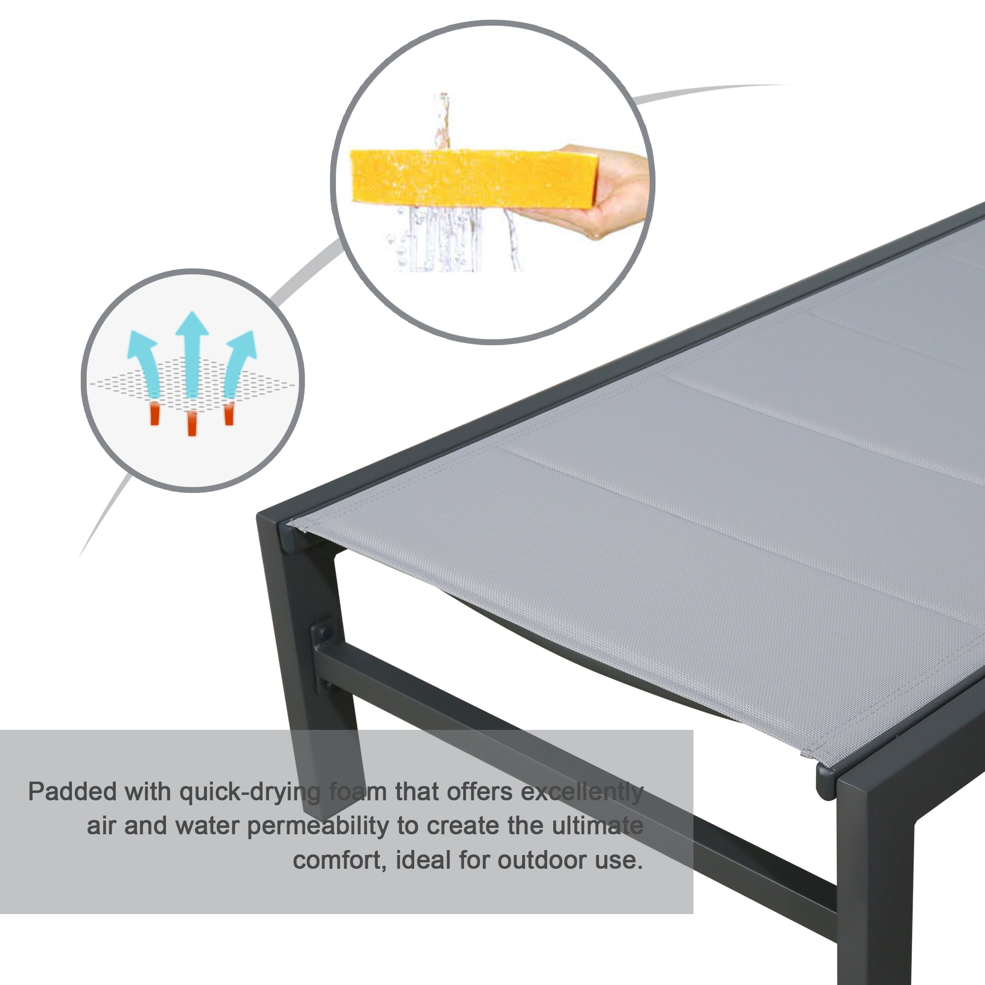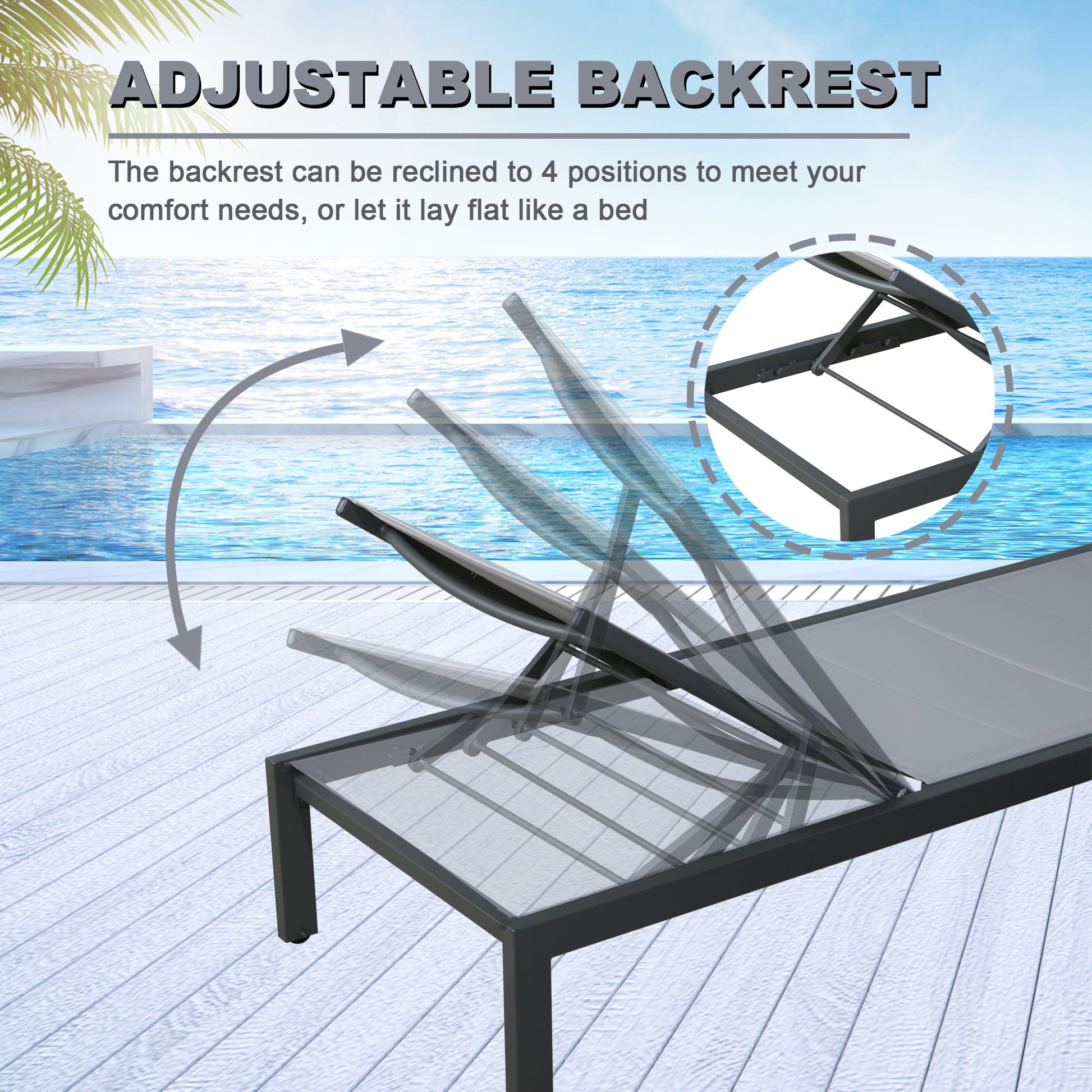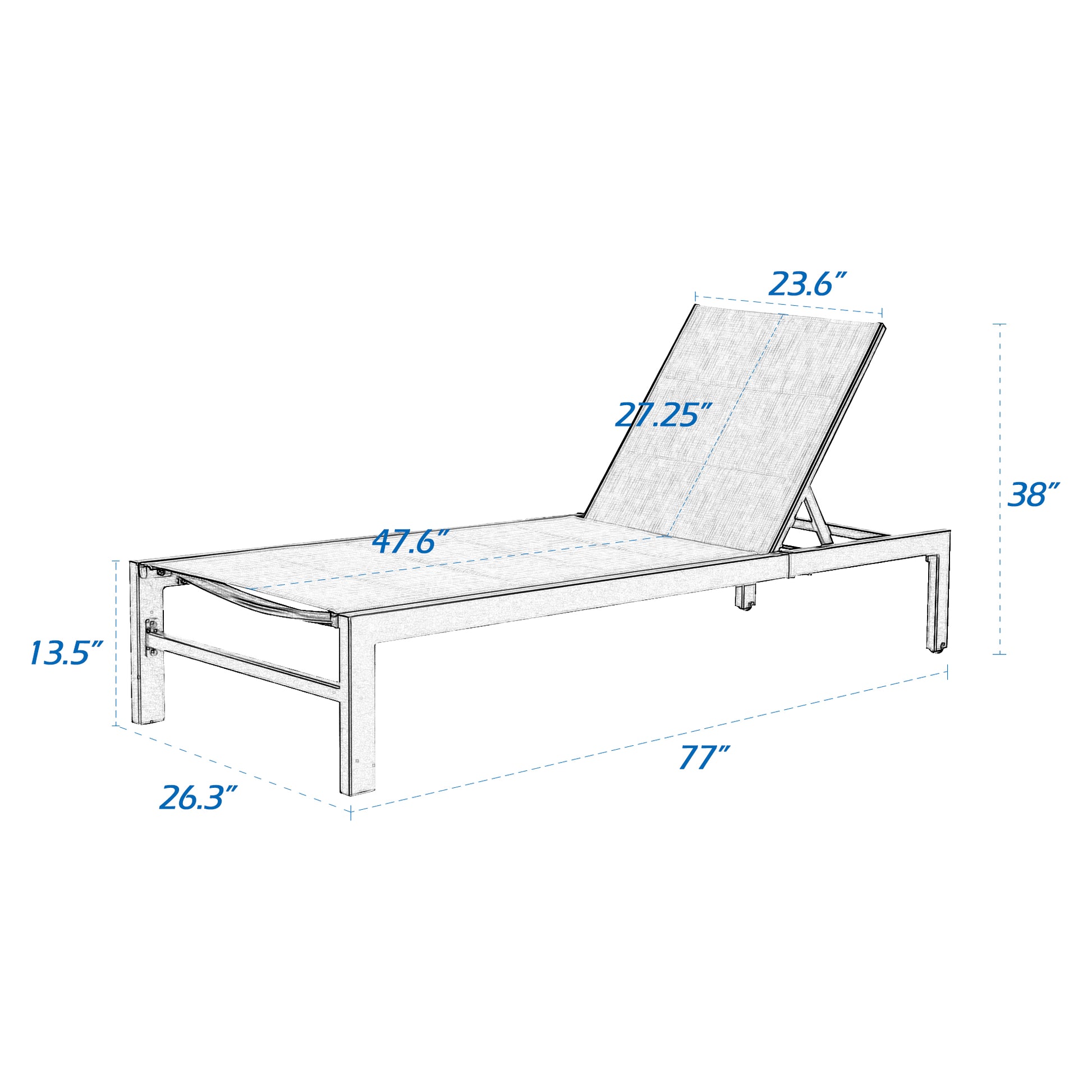 These fashionable and functional Chaise Loungers fit perfectly near any swimming pool or garden area. Made of powder coated aluminum frame and breathable Textilene sling fabric padded with quick dry foam, these outdoor chaise lounges are designed to provide long-lasting use and experience the ultimate in comfort. Stable construction and high-quality fabric allow the chaise lounge to support up to 300 lbs. Meanwhile, you can recline the backrest to 4 positions or let it lay flat like a bed to enjoy the sunshine with your family and friends. With two wheels on the back legs and light weight of the aluminum frame, the sun lounger set can be moved easily.