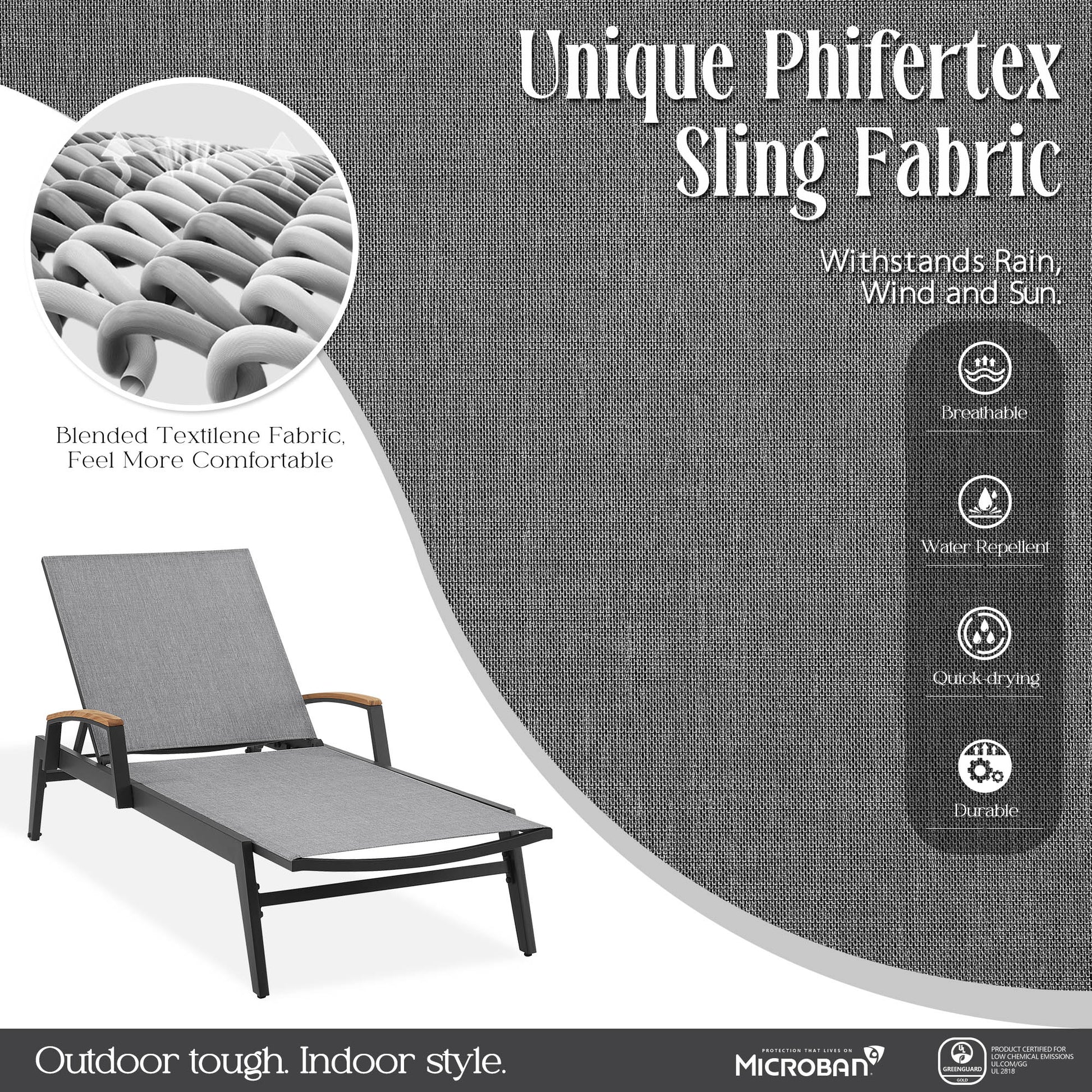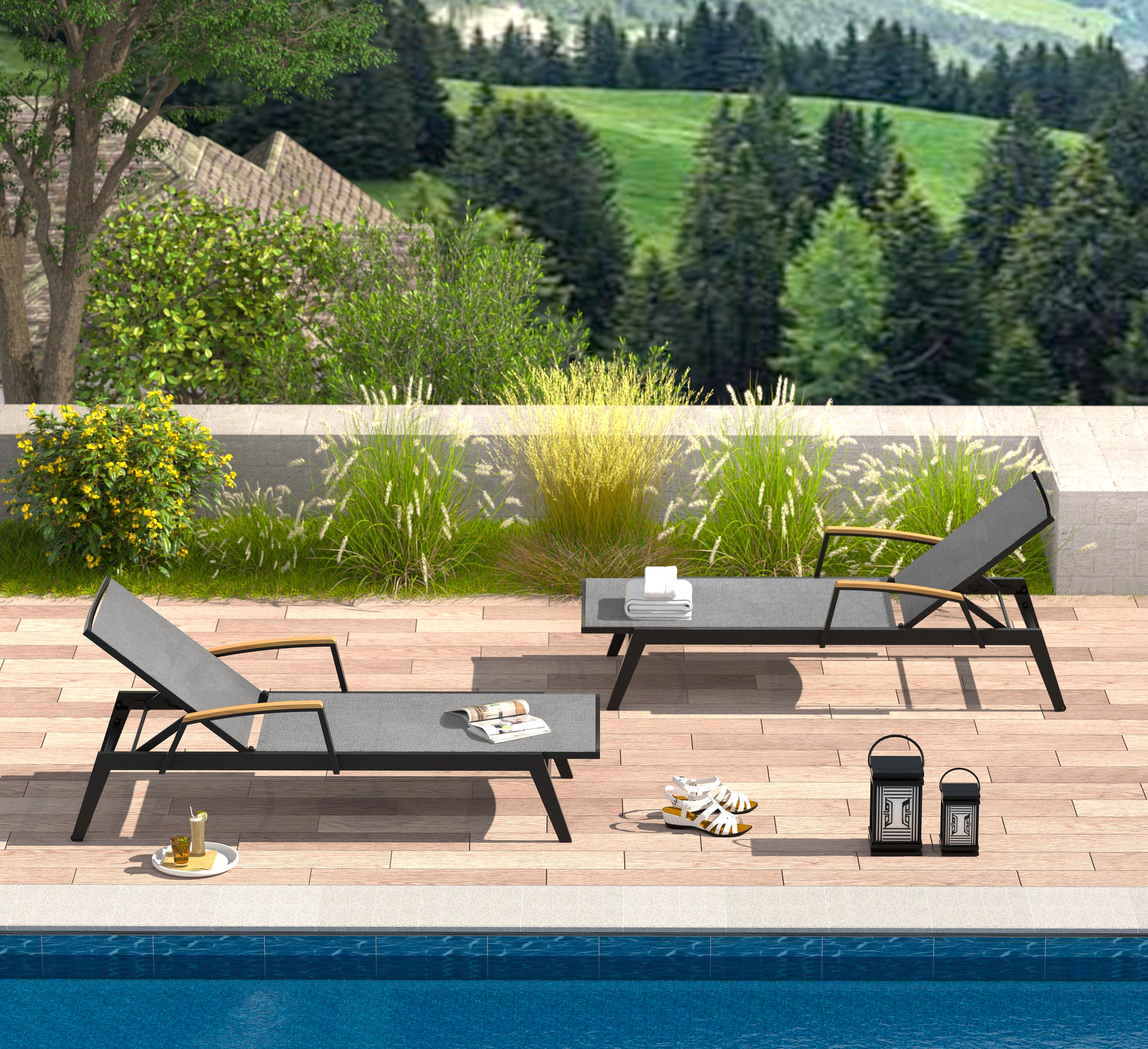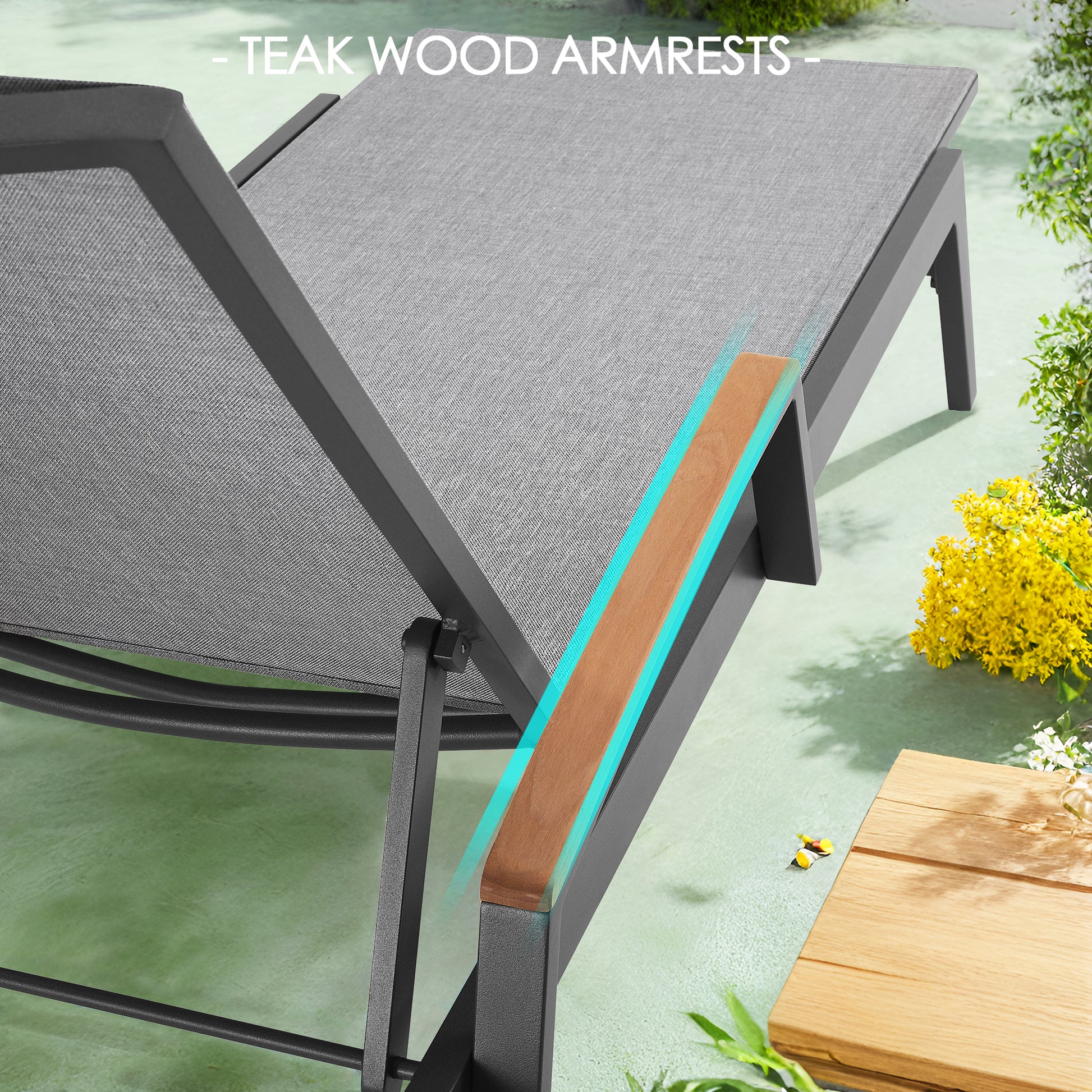 These beautiful and well-made patio chaise lounge chairs are the perfect addition to your outdoor space. This set includes two lounge chairs constructed with a stable aluminum frame and breathable sling fabric that ensures both durability and style. Each chair is equipped with four adjustable positions, allowing you to find the perfect angle for lounging. The armrests are specially decorated with teak wood, adding a touch of elegance to the design. The back legs of the chair have wheels, and you can easily move the chair to the position you want.