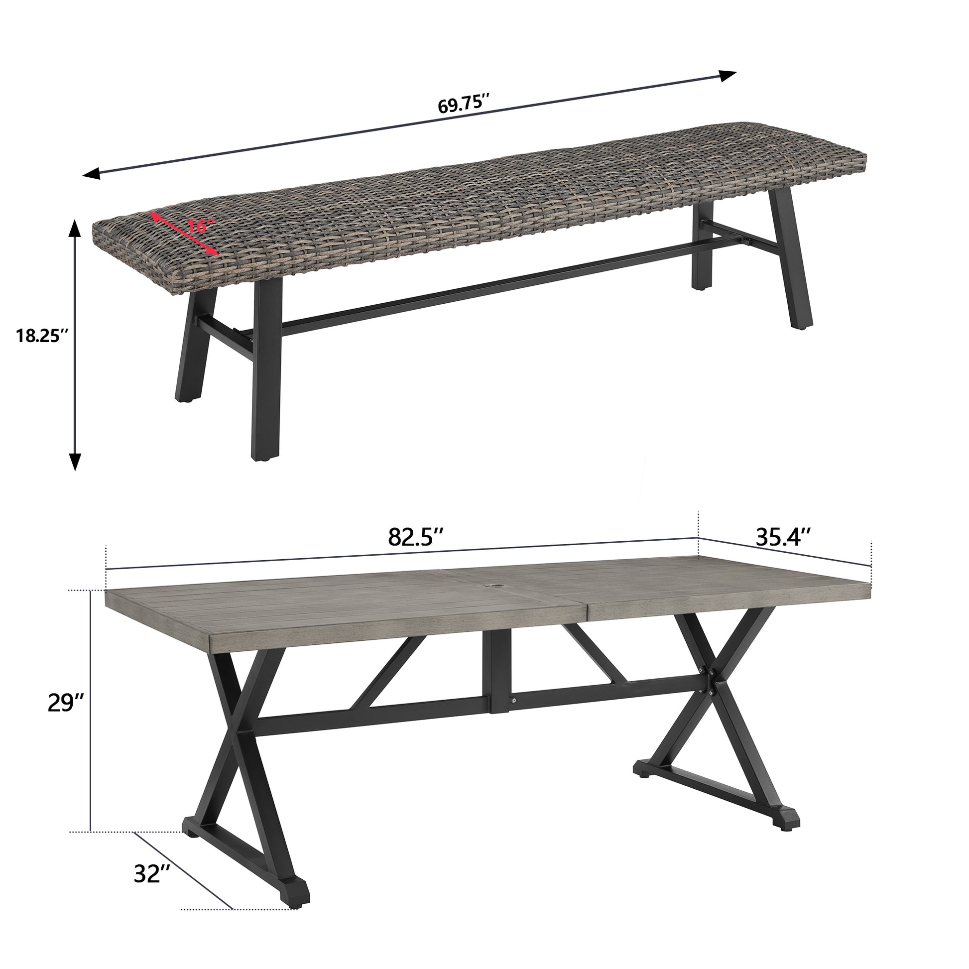 - Overall Dimensions: Table: 82.5"L x 35.4"W x 29"H, Umbrella hole: 1.69"; Outdoor wicker beach: 69.75"L x 16"W x 18.25"H. Easy assembly. Large size enough to accommodate 6-8 people.