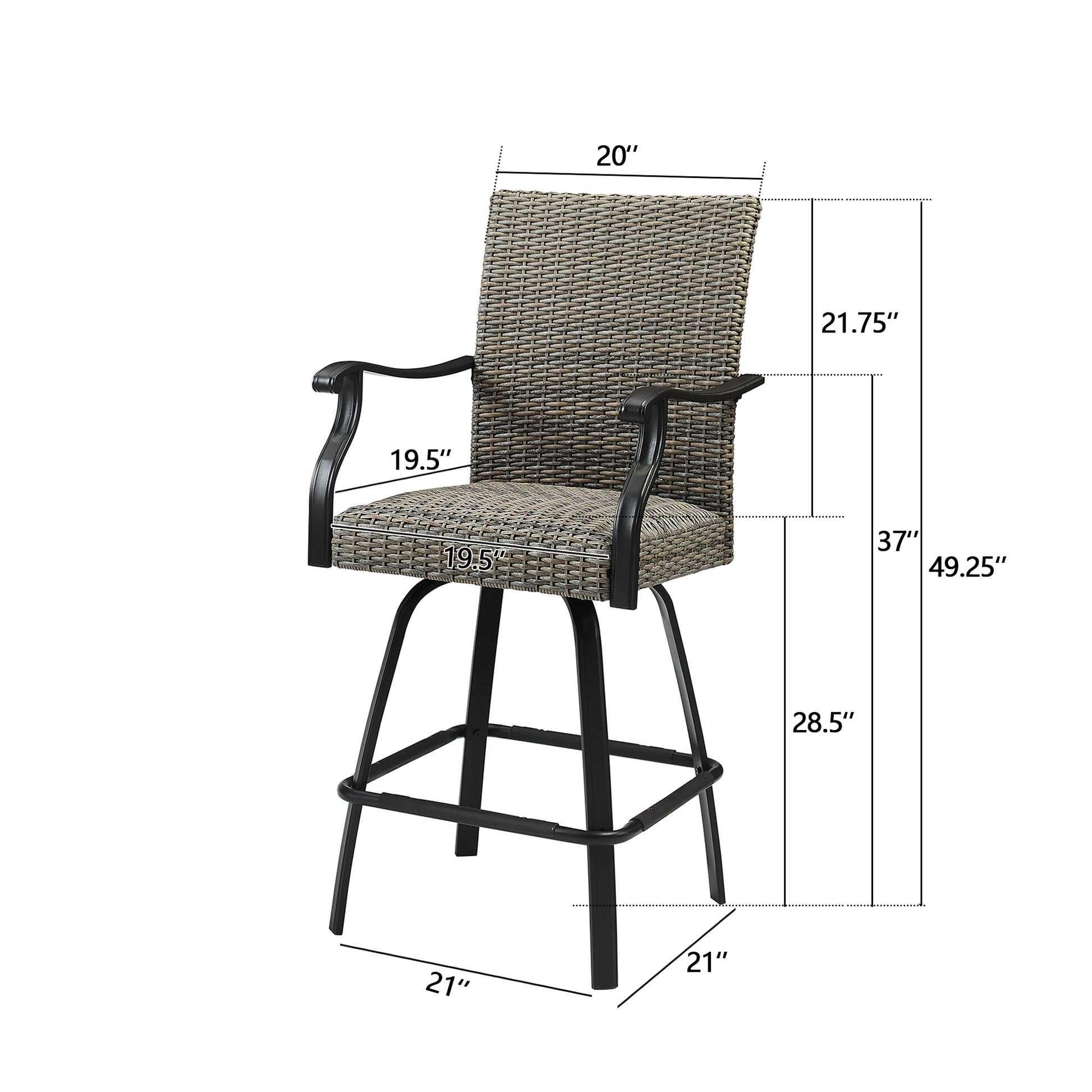 Elevate your indoor or outdoor space with Peak Home Furnishings’Swivel Bar Stools, designed for unmatched comfort and longevity. Crafted with arustproof powder-coated steel frame andall-weather handwoven PE wicker, these stools withstand harsh weather while maintaining their sleek appearance. The360-degree swivel mechanism ensures effortless movement, while theergonomic backrest, padded armrests, andextra-thick quick-dry foam seat deliver premium comfort for hours of relaxation.
