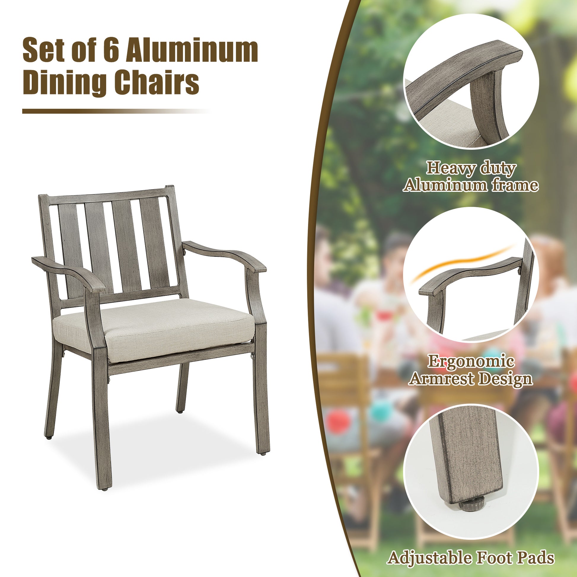 This 8 person Aluminum dining set includes a square dining table with 1.96” umbrella hole, six swivel chair, and a 2-seat bench, giving you the means to create an oasis of comfort in your outdoor space. The color of this set is a beautiful brushed gray, it is sturdy, and a nice size. The chairs and bench are wide and the cushions are comfortable. its durable build will keep this set looking like new for years to come.