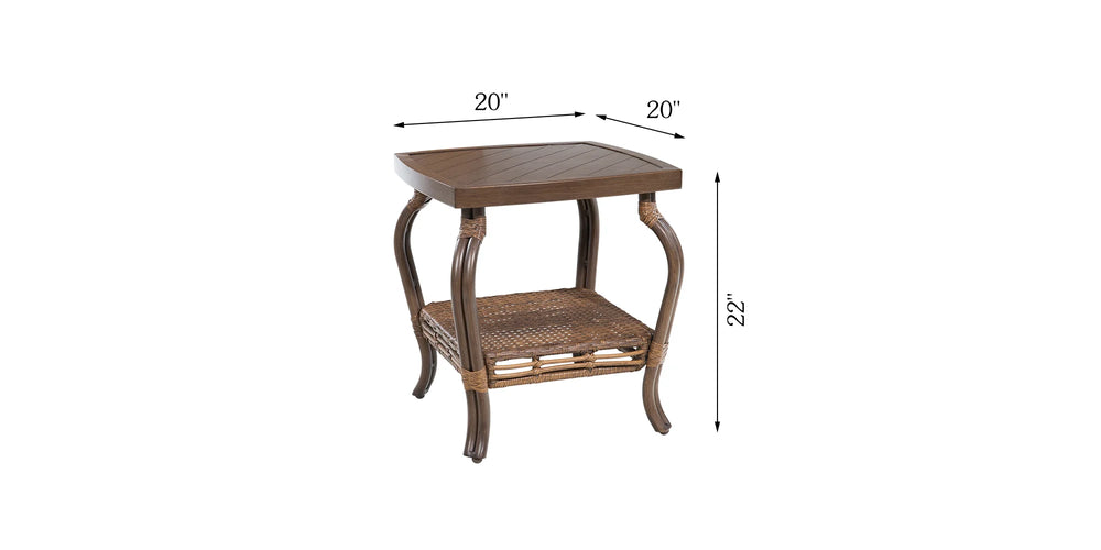 Our aluminum square side table, crafted with precision and featuring a two-tier design, offers a perfect blend of style and practicality, making it an excellent addition to your living space. The innovative PE rattan wicker shelves provide additional storage space for your belongings or for displaying decorative items. The uniquely curved legs not only ensure the table's stability but also add a sophisticated touch to its overall appearance. The tabletop, with its slatted wood-grain design, is not only visually appealing but also easy to care for, making it a versatile piece for your outdoor furniture collection. Built for durability, this table will retain its fresh look for many years.