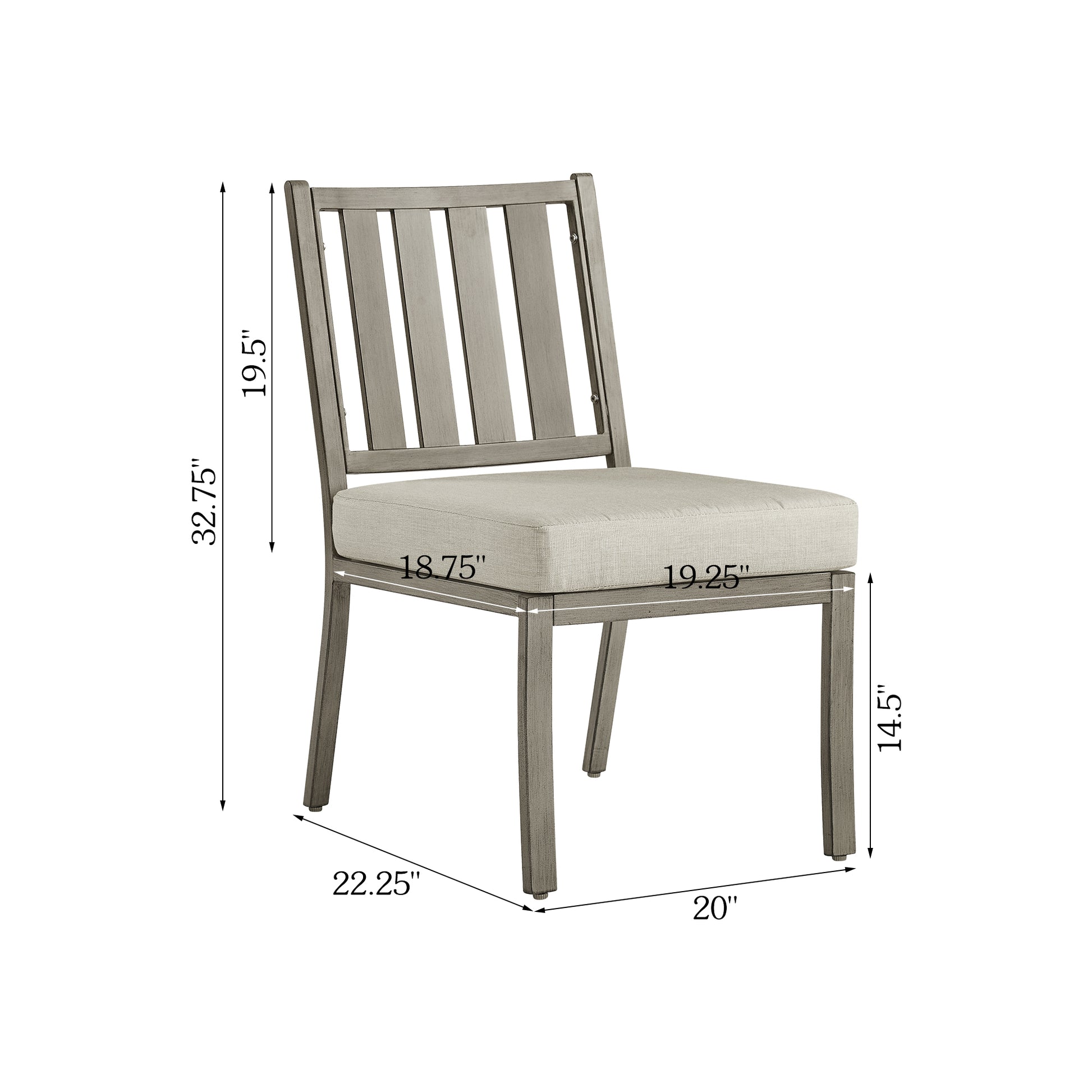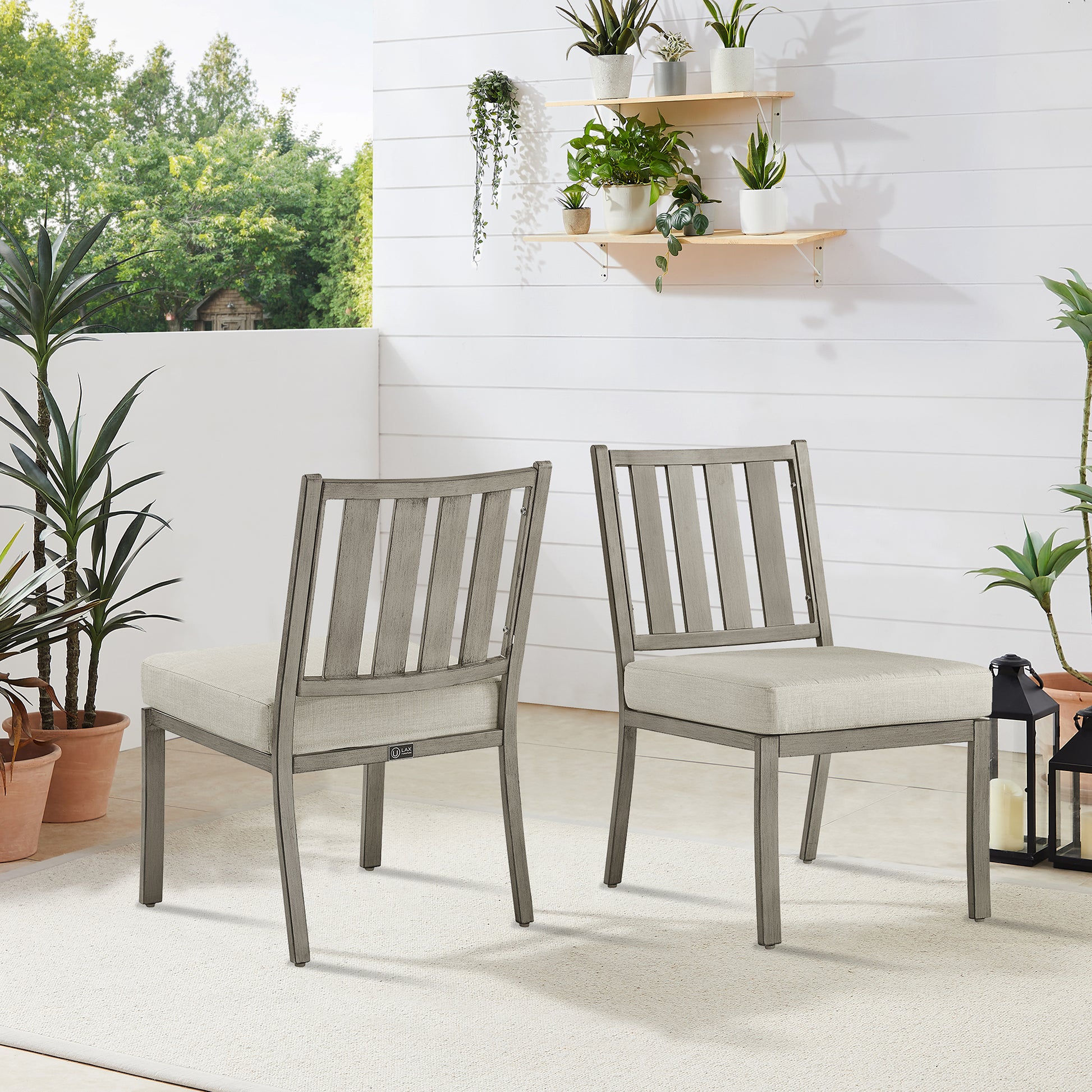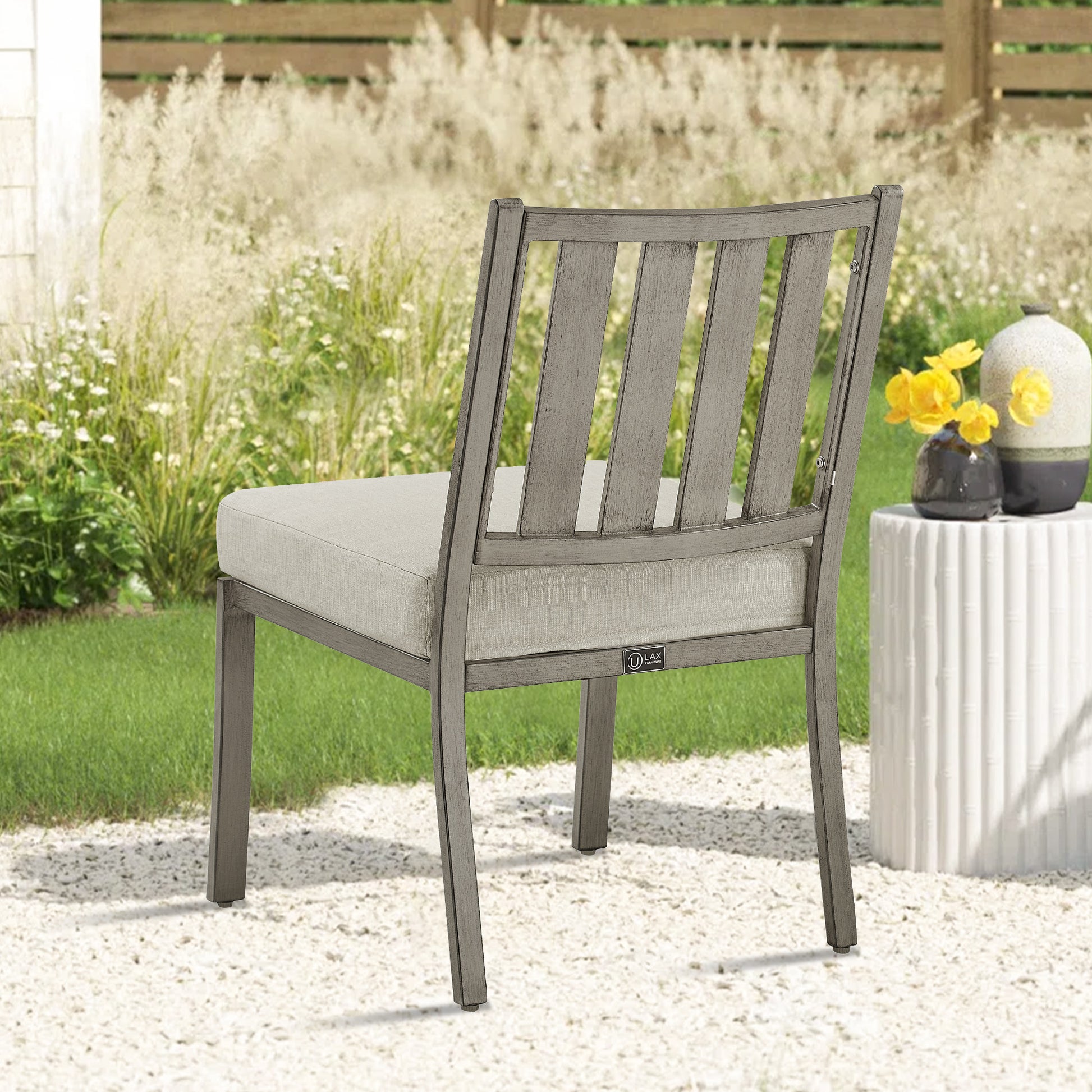 Two simple and modern dining chairs, they attract people's attention with their unique design and practical functions. The chair is designed without armrests, making the overall shape more smooth and simple. The main frame of the chair is made of high quality aluminum material, ensuring its stability and durability, which is ideal for outdoor use. Cushion covers are made of high-quality sunbrella fabric, a material with good air permeability and wear resistance that effectively resists the effects of adverse outdoor weather while providing a comfortable feeling of sitting. The interior of the cushion is filled with soft synthetic fiber, which further enhances the comfort and durability of the cushion. The back part of the chair adopts the slatted design, which is not only beautiful and generous, but also increases the breathability of the chair. In general, these two outdoor leisure chairs provide a comfortable, beautiful and durable outdoor leisure choice for people with their simple and modern design, practical functions and high-quality materials.