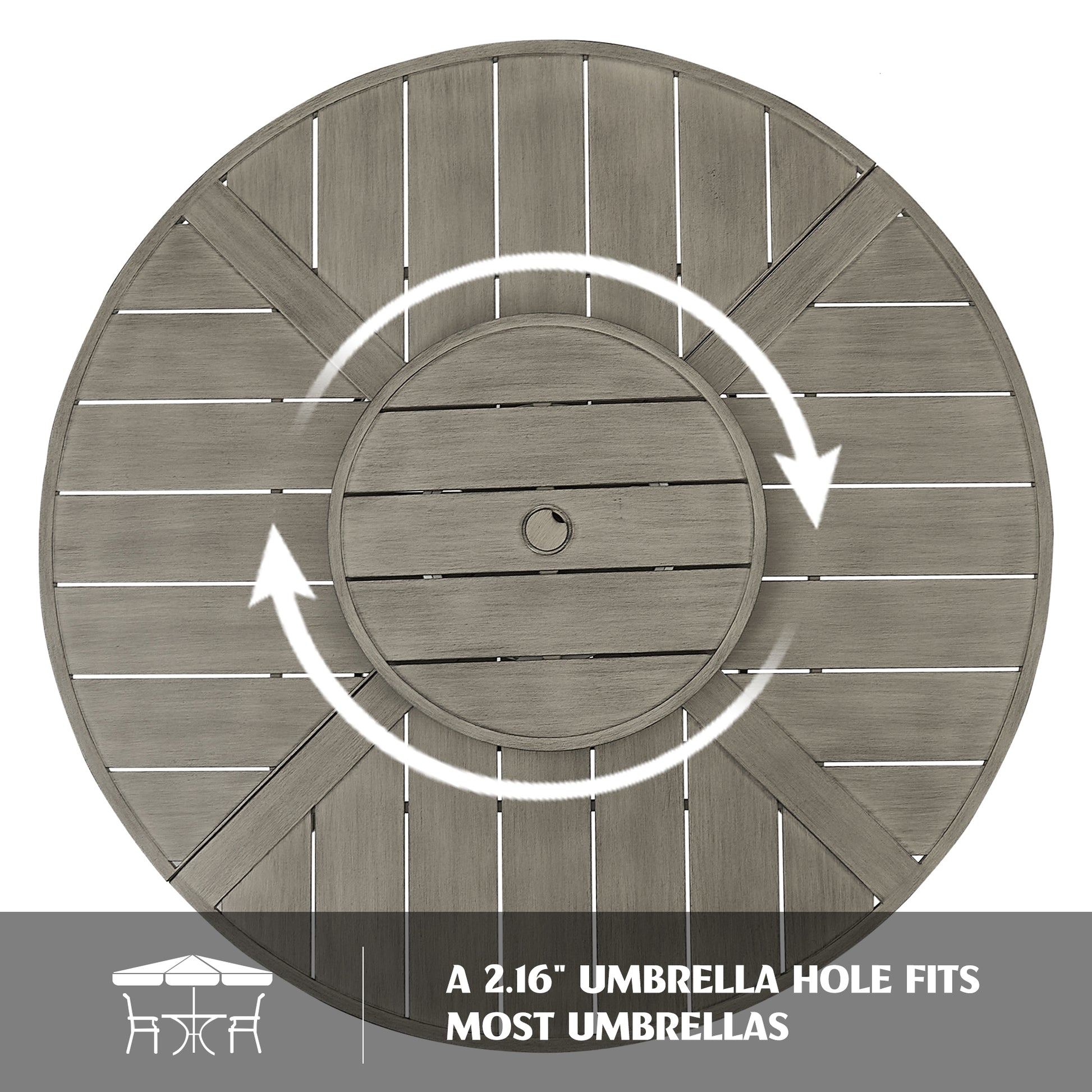 60-inch Round Table: The frame of the round table is powder-coated steel and the table top is aluminum for high durability. It also features 360° rotation and a removeable lazy susan, providing diners with great flexibility and a convenient eating experience, as well as a 2.16-inch umbrella hole.