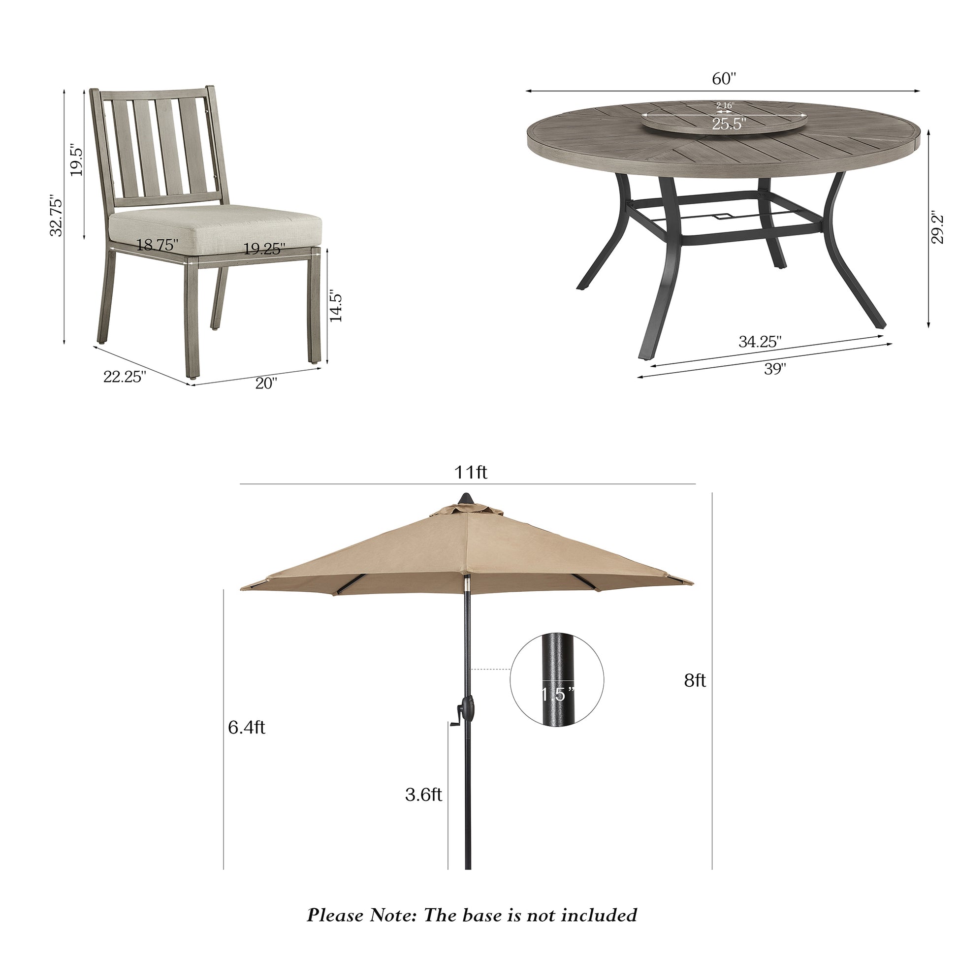 Azur outdoor dining set is beautiful and functional. At the center is a circular, 59.5-inch removable lazy susan table with a powder-coated steel frame paired with an aluminum top, elegantly slatted with gray wood grain. The dining table also features a 2.16-inch umbrella hole for easy use with octagonal umbrellas. The umbrella is made of a metal frame with SPF 98 UV protection to block UV rays and an easy-to-operate crank boom for easy opening and closing. Around the dining table are six aluminum dining chairs with sunbrella cushions for comfort and durability. The whole set of furniture is placed in an outdoor courtyard, creating a comfortable dining and relaxation space.