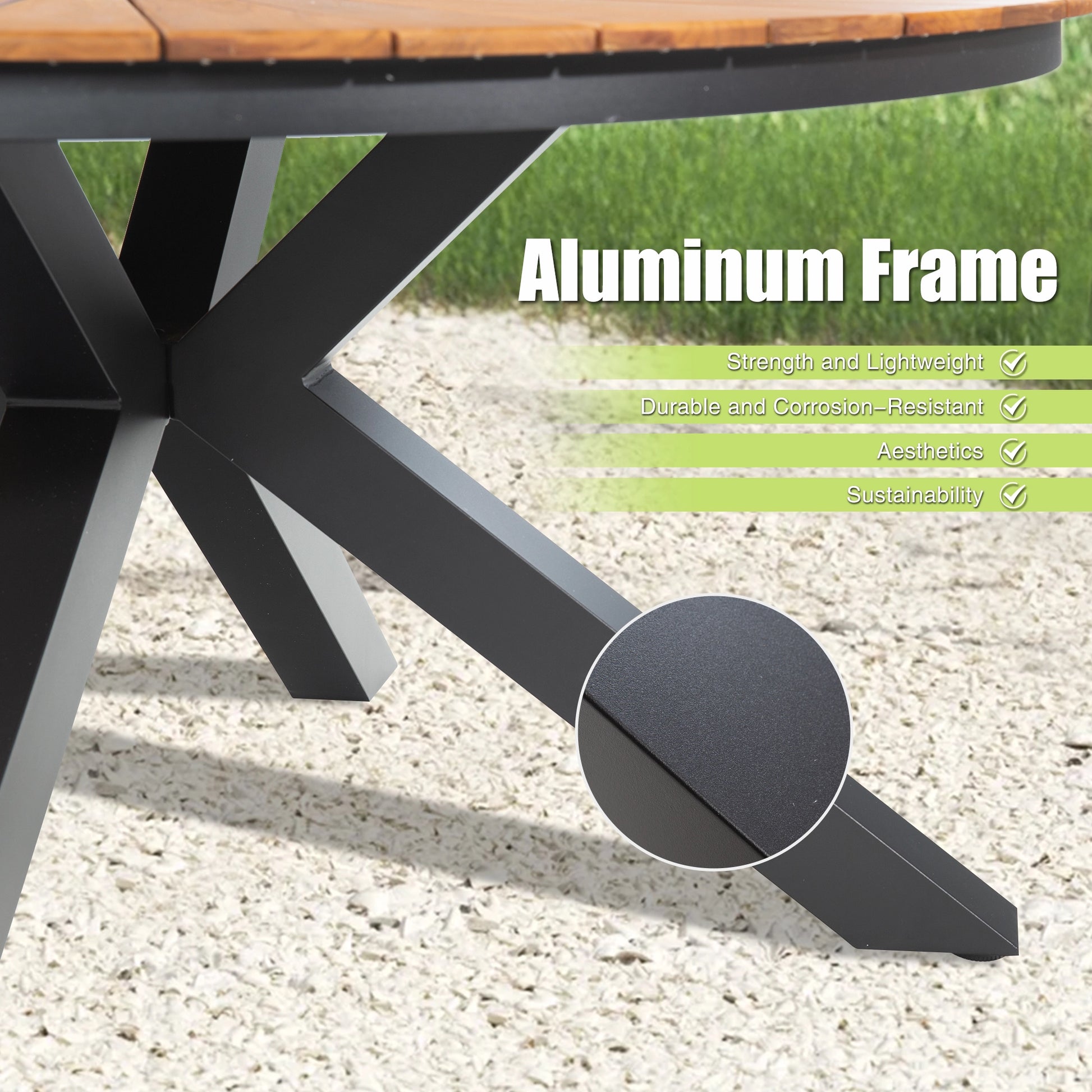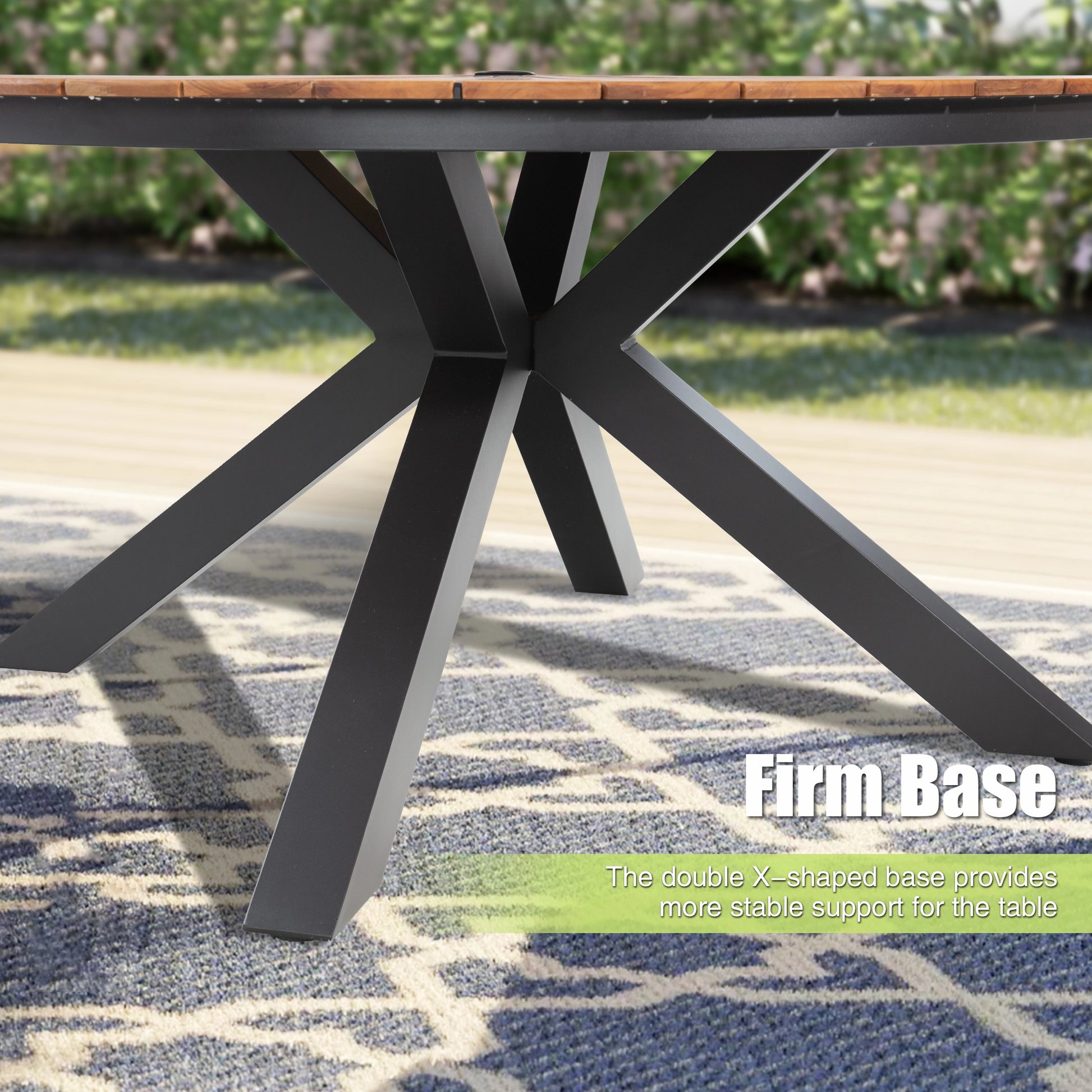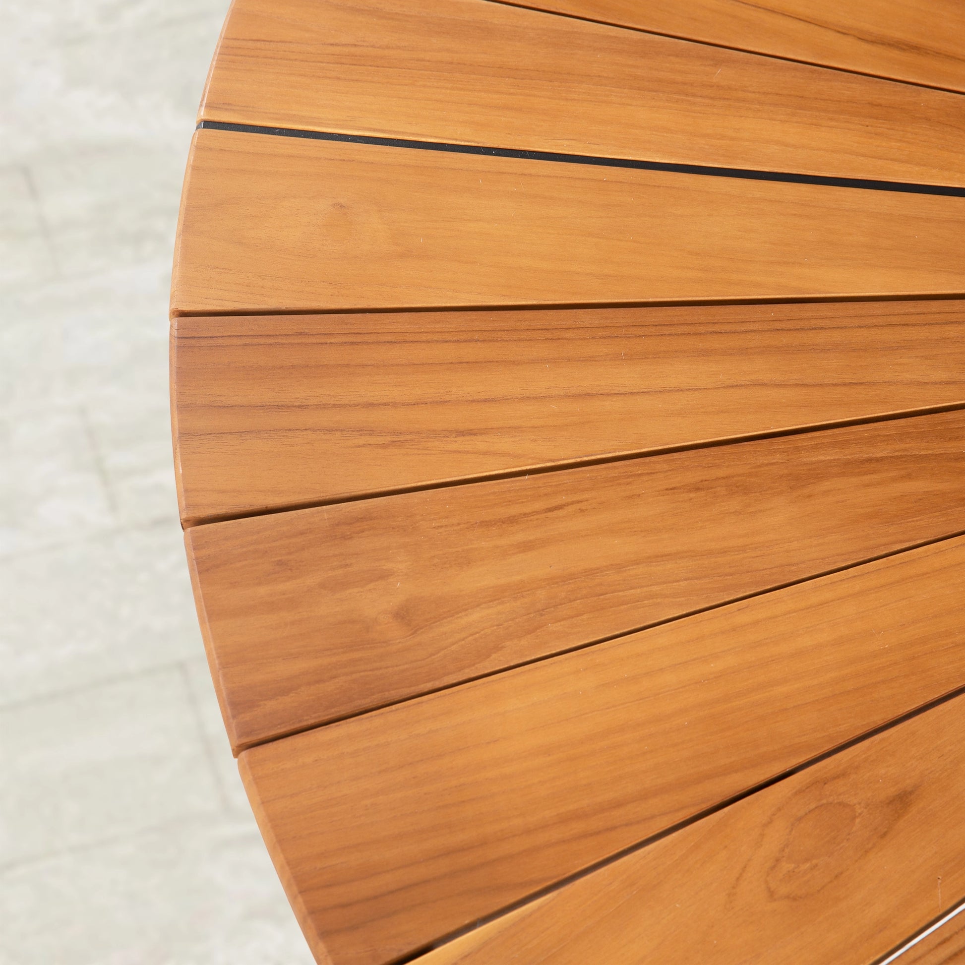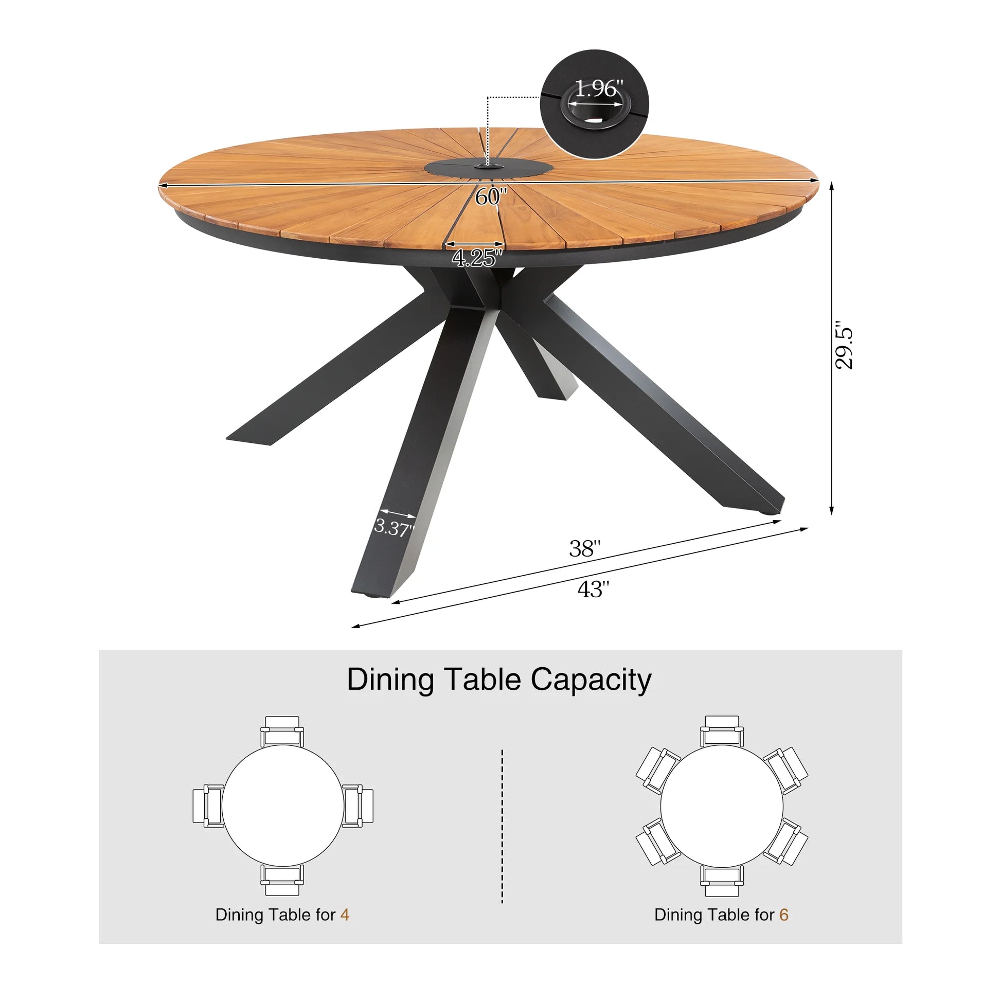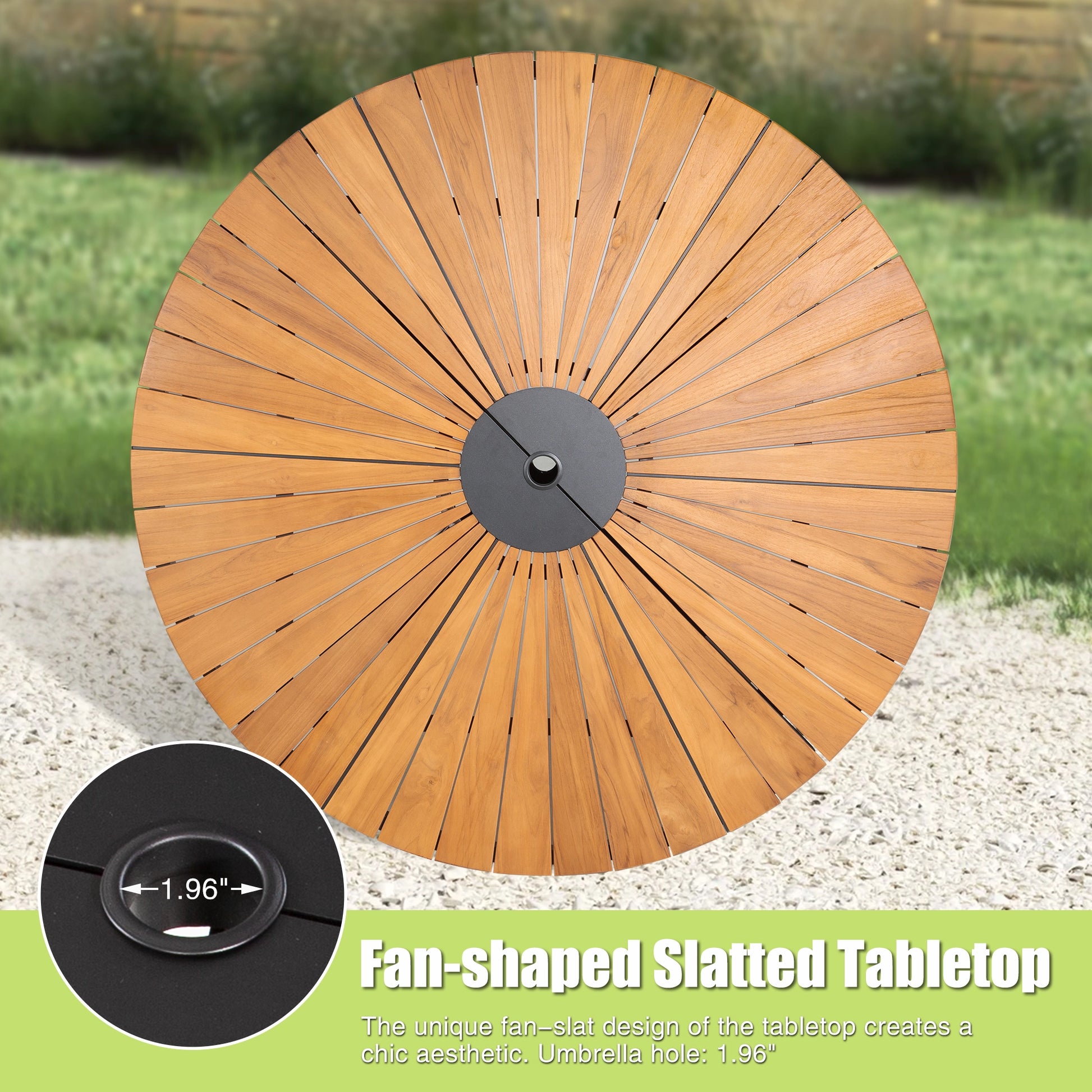 - 60” diameter tabletop with fan-shaped teak slats and a 1.96” umbrella hole.