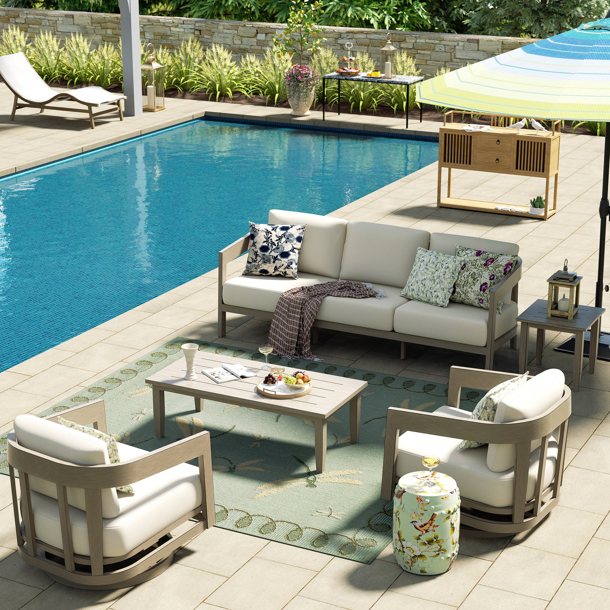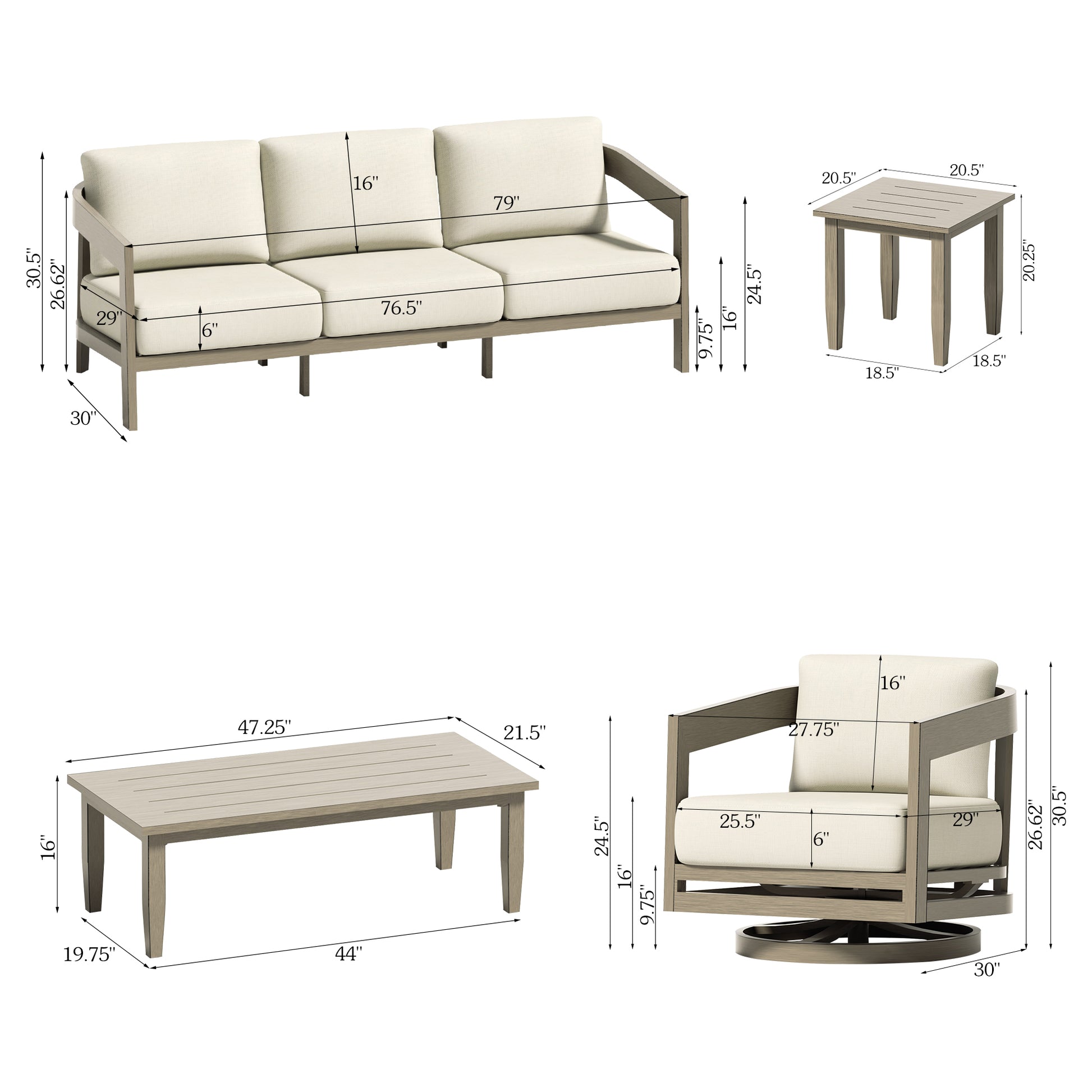 Discover the perfect way to revamp your outdoor area with our all - inclusive furniture collection. This set brings together a sumptuous sofa, two versatile swivel chairs, a sophisticated coffee table, and a handy side table. Each piece is painstakingly crafted from premium - grade aluminum, flaunting a captivating barley - colored frame. This warm - toned hue has an uncanny ability to meld with any outdoor decor. The cushions are made from olefin fabric. This material not only offers a plush and inviting seating feel but also guarantees long - lasting toughness. So, you can fully immerse yourself in your outdoor activities, be it reading a book or having a chat, without a care about wear and tear. The design of the sofa and chairs is a masterclass in ergonomics. Their gently curved backs transition smoothly into the slatted seats. This not only gives the furniture a distinct and stylish look but also provides excellent support for your body, making relaxation a breeze. A truly remarkable aspect of the swivel chairs is their full 360 - degree rotation feature. This offers you an unrivaled level of flexibility. Whether you're engaged in a lively conversation with friends or just unwinding while enjoying the view, you can effortlessly adjust the chair's orientation with a simple twist. Both the coffee table and side table feature slatted tops. This design element not only adds an interesting visual touch to the set but also makes cleaning and upkeep incredibly easy. You can quickly wipe away any dirt or spills, ensuring your furniture stays looking pristine. This elegant outdoor furniture set is the ideal choice for both hosting guests and spending quality time with family. It's an essential addition that will transform your outdoor space into a luxurious and comfortable oasis.