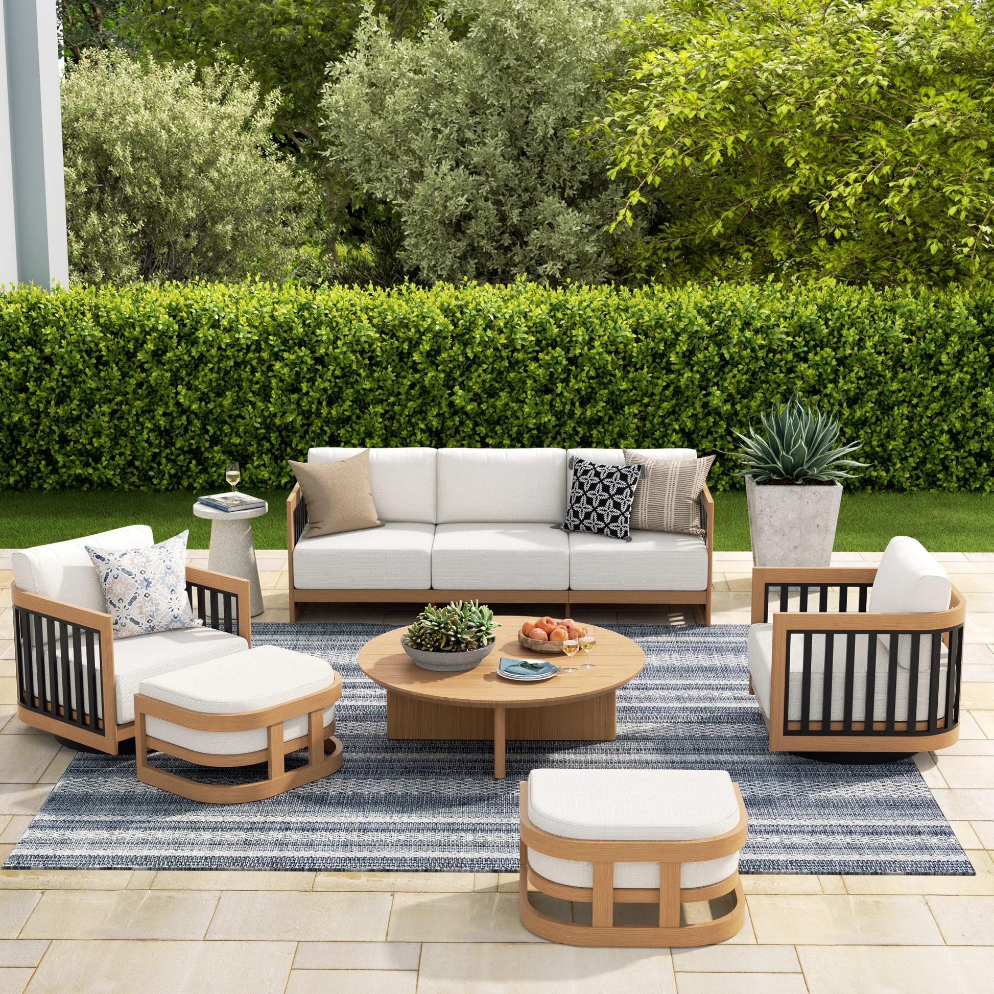 This complete set includes a 3-seater sofa, two 360° swivel armchairs, two ottomans, and a round coffee table, creating a versatile seating area for gatherings or quiet relaxation. The frame is crafted from premium aluminum tubing with a powder-coated, heat-transfer teak finish—delivering the timeless look of natural teak without the maintenance, while resisting rust, corrosion, and outdoor elements.