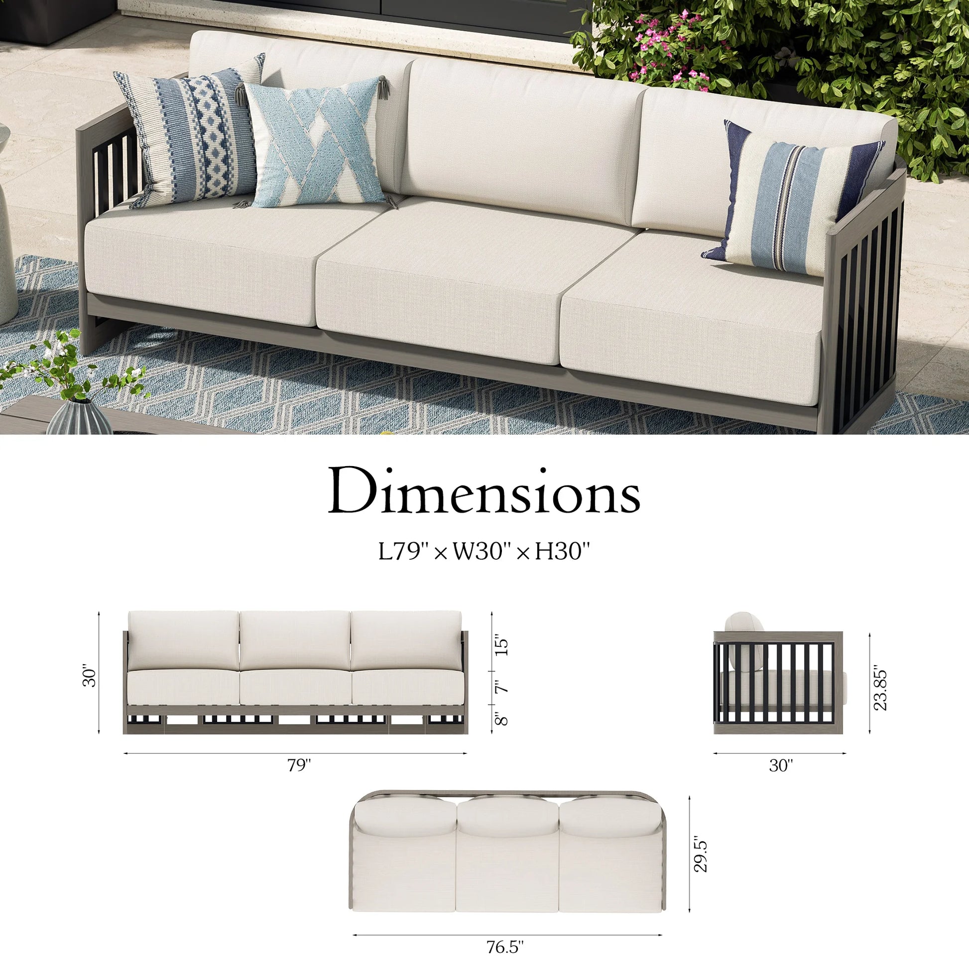 Elevate your outdoor living experience with our premium patio 3-seater sofa, crafted with a powder-coated aluminum frame that is rust-resistant, durable, and requires minimal maintenance for long-term use. Designed for superior ergonomics, the sofa includes 7-inch thick seat cushions for optimal support and plush back cushions for added relaxation. High-quality olefin fabric cushions with zippered, removable covers—offering excellent weather resistance, ease of cleaning, and enhanced outdoor comfort. The sleek design includes vertical slats on the sides and two elegant frame finishes: hand-brushed or heat-transferred. Perfect blend of luxury and functionality!