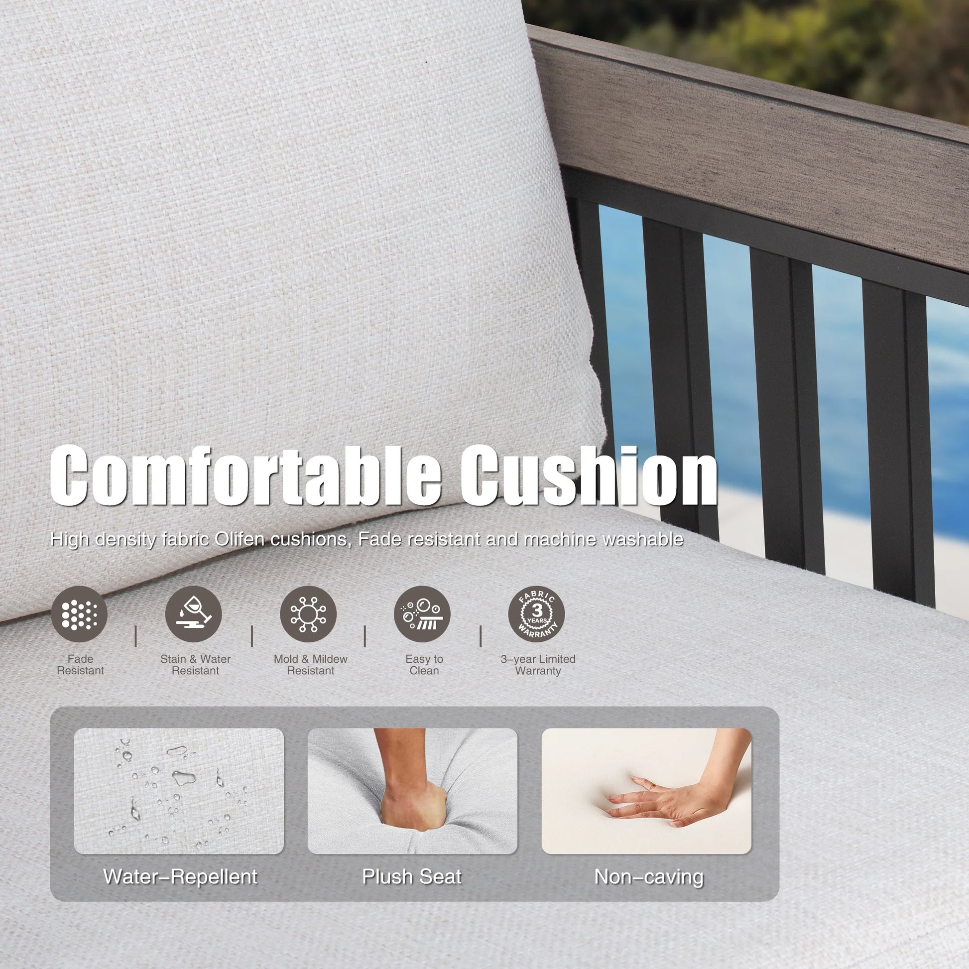 - Comfort Olefin Cushions – Features 7-inch thick seat cushions with premium support, wrapped in fade-resistant Olefin fabric and are equipped with zippers for easy removal and cleaning, perfect for all-day lounging.