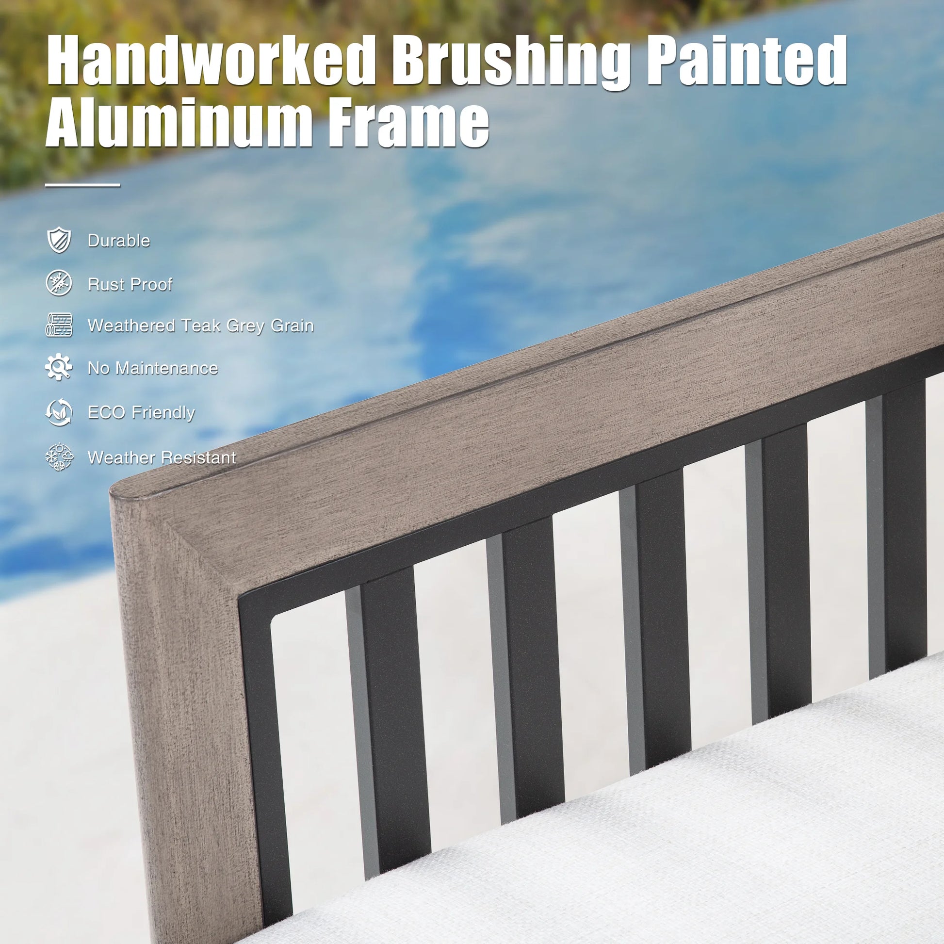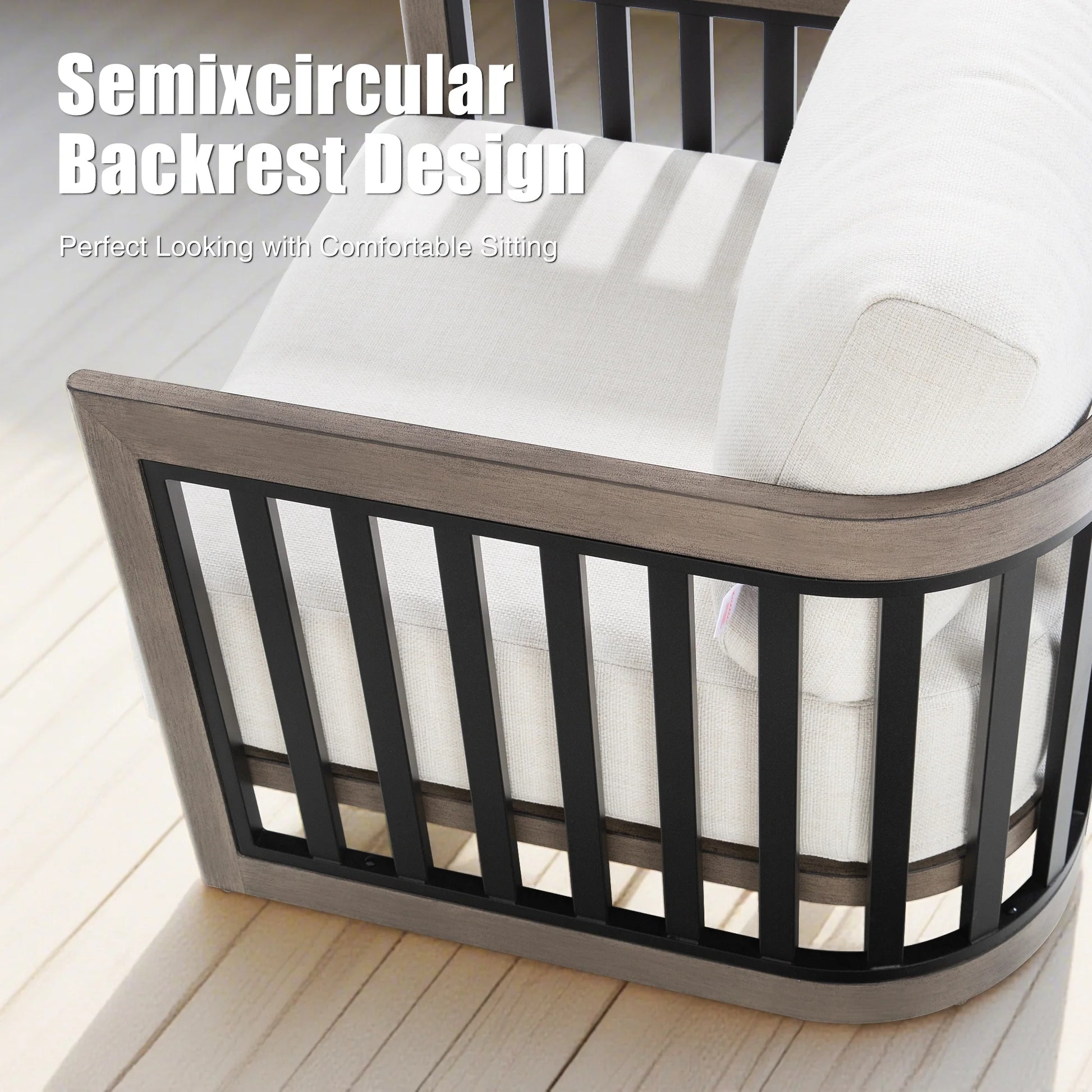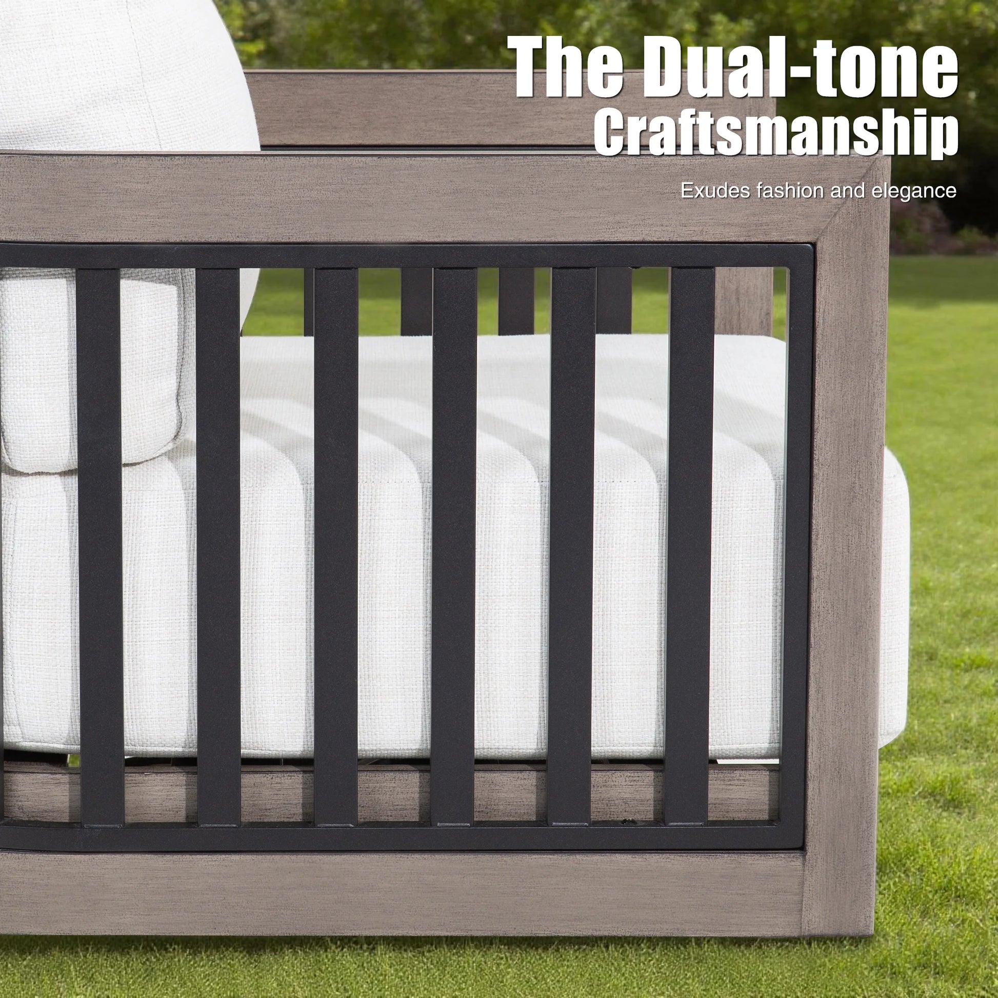 Elevate your outdoor living experience with this sophisticated and durable patio conversation set. Crafted with a powder-coated aluminum frame, this set offers excellent rust resistance, durability, and minimal maintenance for long-term outdoor use. Featuring 7-inch thick seat cushions that provide firm support, along with plush back cushions for added relaxation. High-quality olefin fabric cushions with zippered, removable covers, offering excellent weather resistance, ease of cleaning, and enhanced outdoor comfort. Available in a modern design featuring a 3 seater sofa, two club swivel armchairs, and a slatted coffee table, this set comes in two elegant color schemes: smoke gray/black or teak/black. Ideal for placement near a pool or on a patio, this set enhances any outdoor space.