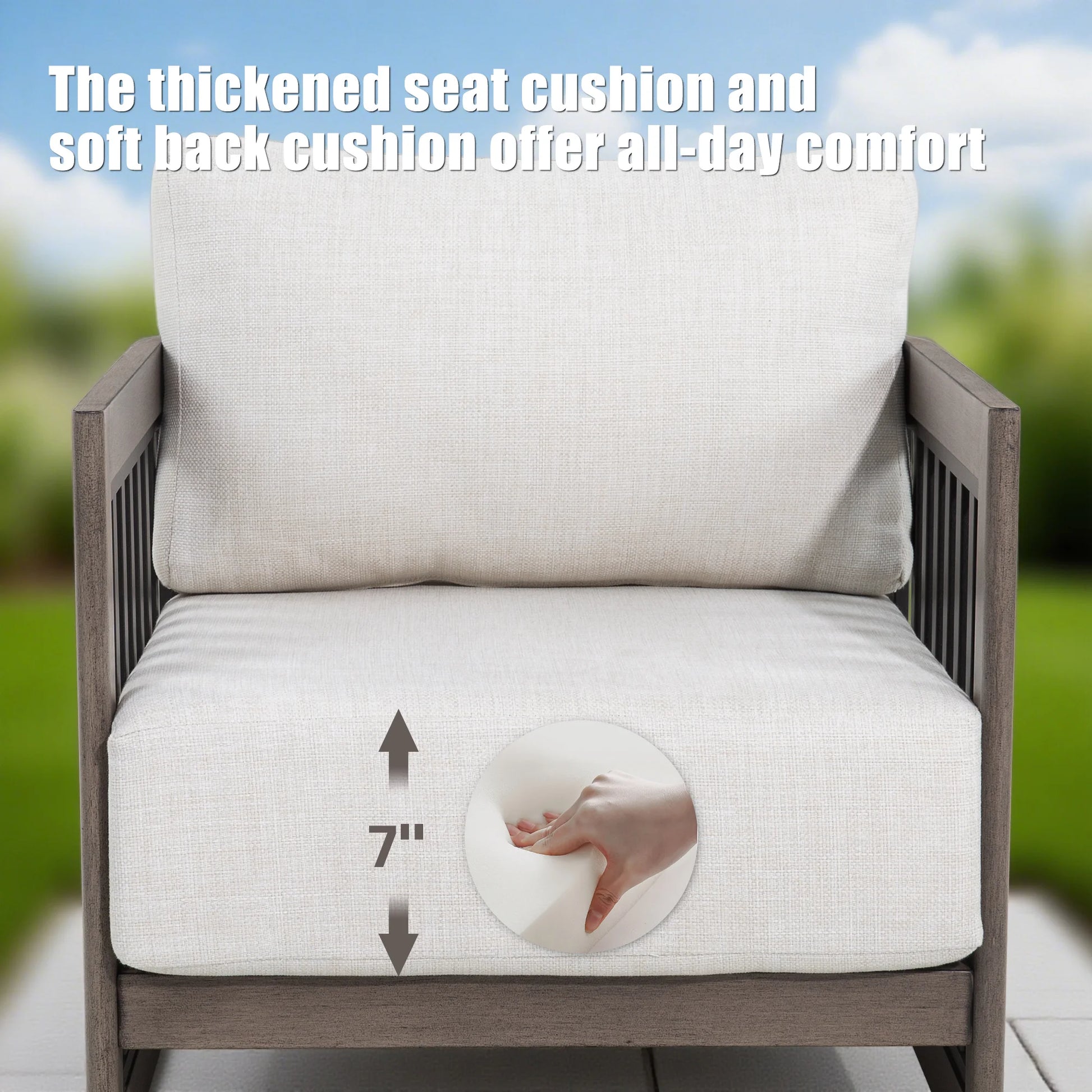 - Comfort Olefin Cushions – Features 7-inch thick seat cushions with premium support, wrapped in fade-resistant Olefin fabric and are equipped with zippers for easy removal and cleaning, perfect for all-day lounging.