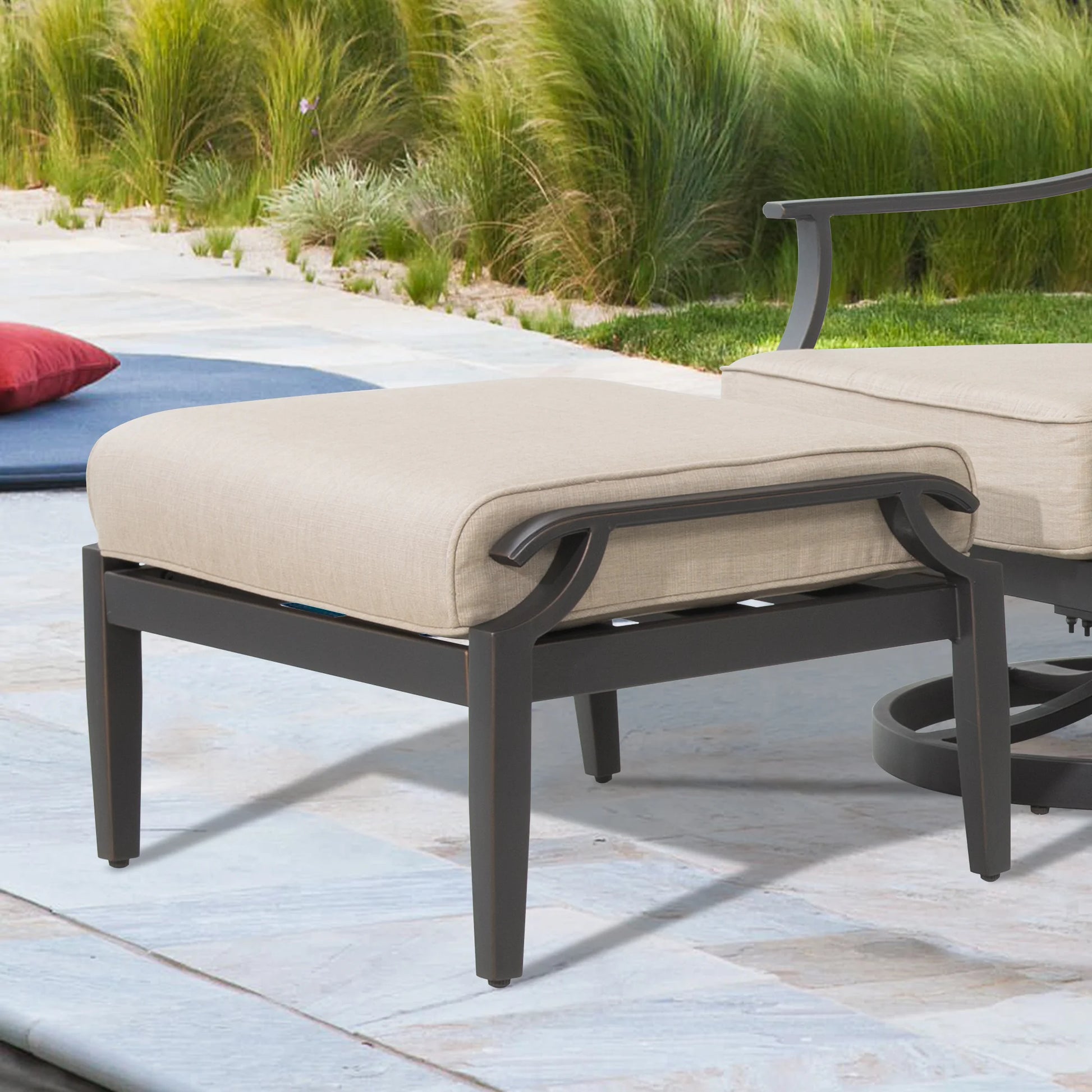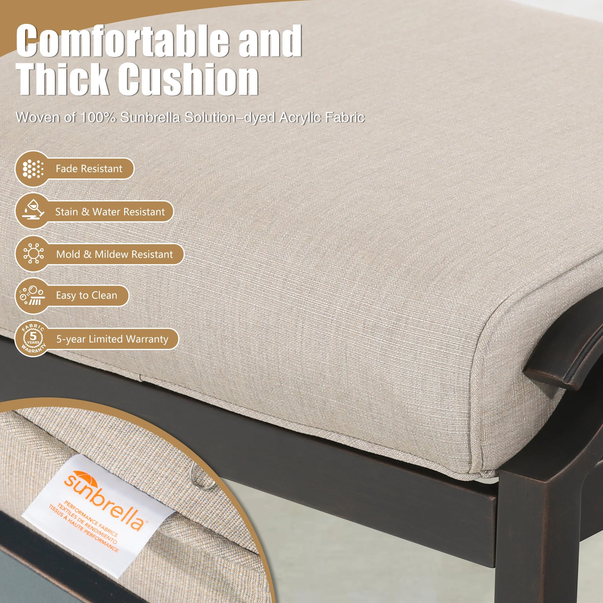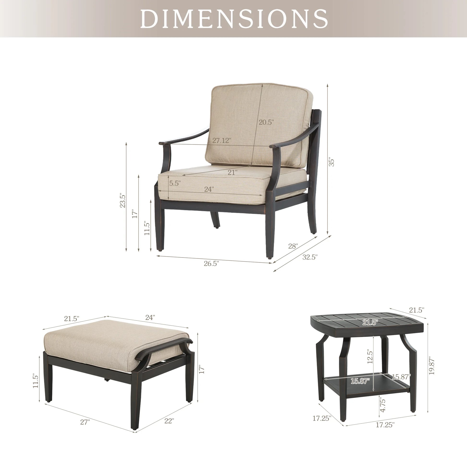 Patio relaxation has never looked better than with the Tamarin 5pc Chair Set by Peak Home Furnishings. This exquisite collection features two ergonomic armchairs with curved armrests, two matching ottomans, and a versatile side table, all crafted from weather-resistant aluminum with a hand-brush painted bronze finish. The Sunbrella® cushion covers provide exceptional durability, offering breathable comfort that resists stains and fading. Perfect for lazy afternoons with a book or evening conversations, the set combines elegant design with practical functionality, including the side table's dual-layer storage. Experience premium patio relaxation with this durable, stylish ensemble.