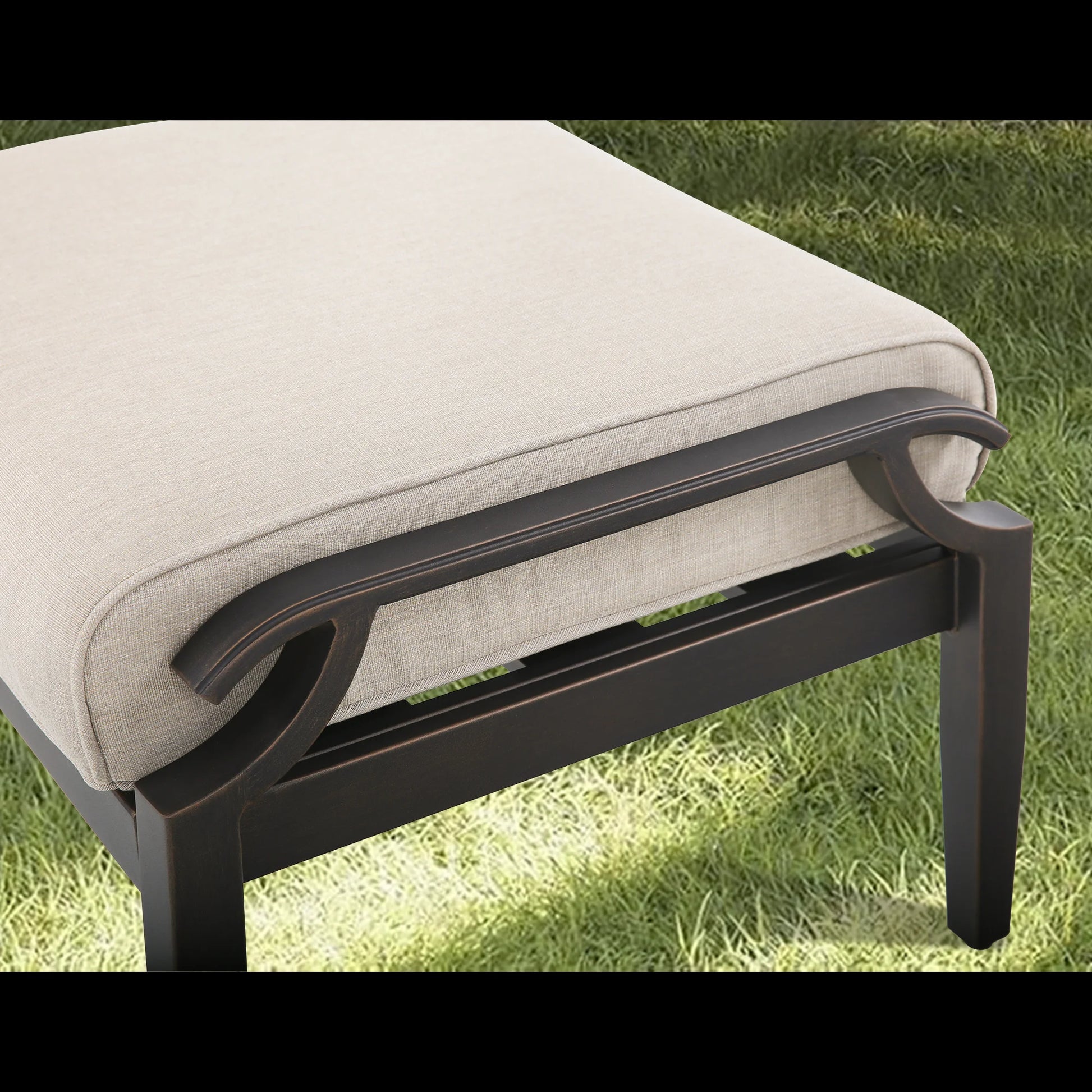 The Tamarin Ottoman by Peak Home Furnishings redefines luxury with its meticulous craftsmanship. The aluminum frame undergoes a refined powder-coated base, followed by hand-brush painted in bronze, creating a lavish metallic finish that exudes opulence. Upholstered in durable Sunbrella fabric, it offers both elegance and resilience for indoor or outdoor settings. The Superior Extruded Pattern Aluminum Profile adds intricate detailing, blending timeless sophistication with modern design. A statement piece for discerning tastes.