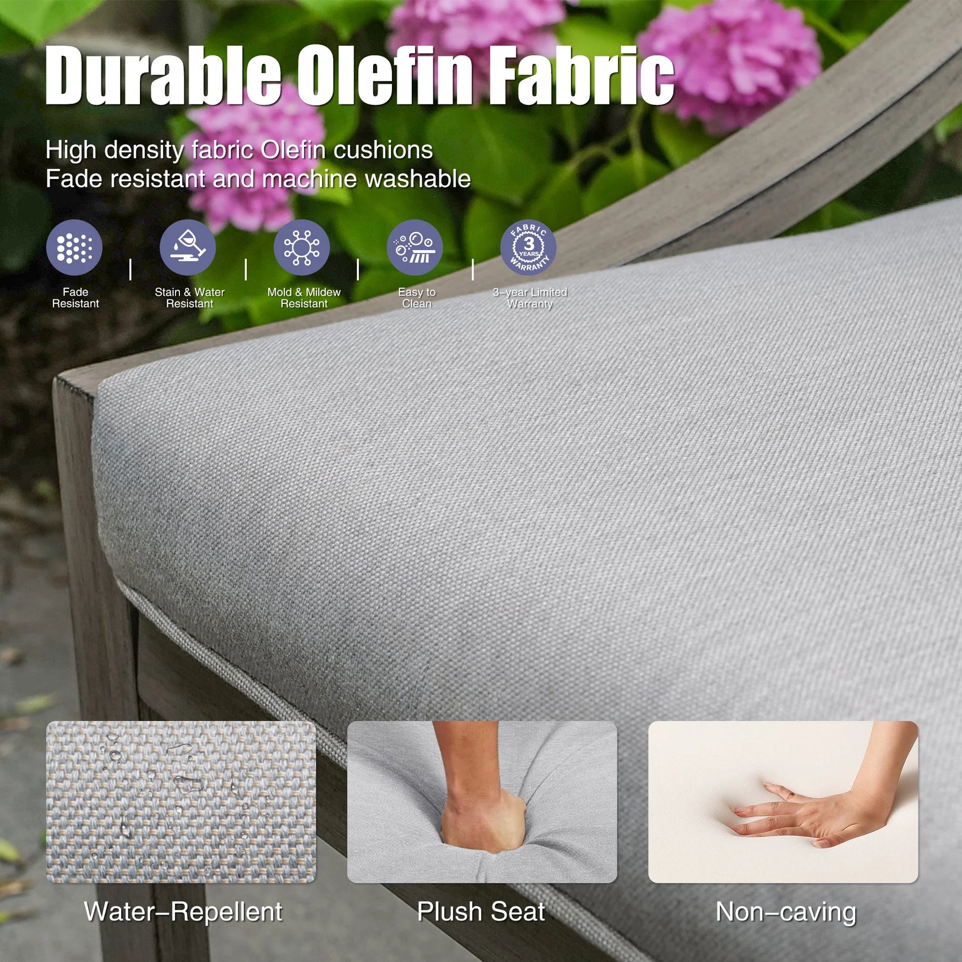 - Durable Olefin fabric cushions (high-density, fade-resistant)