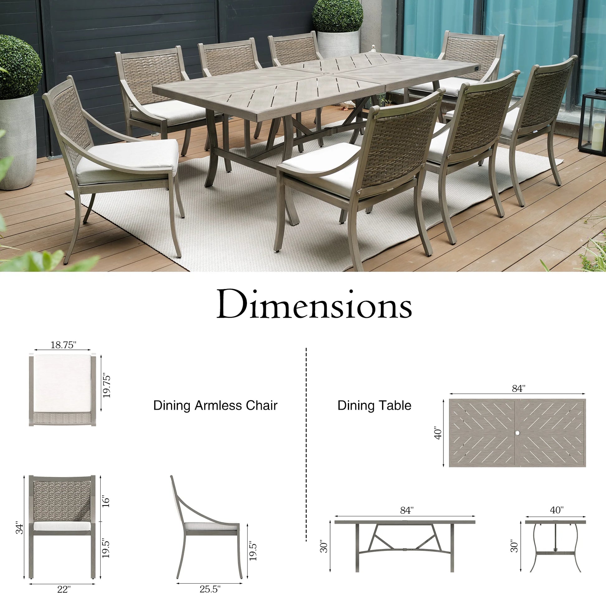 This elegant outdoor dining set features a weather-resistant rectangular aluminum table with steel legs, paired with eight ergonomic chairs. The chairs combine breathable PE rattan backrests, rust-proof aluminum armrests, and powder-coated steel slat seats with removable, washable cushions. A hand-painted teak finish adds sophistication, making it perfect for durable, stylish outdoor entertaining.