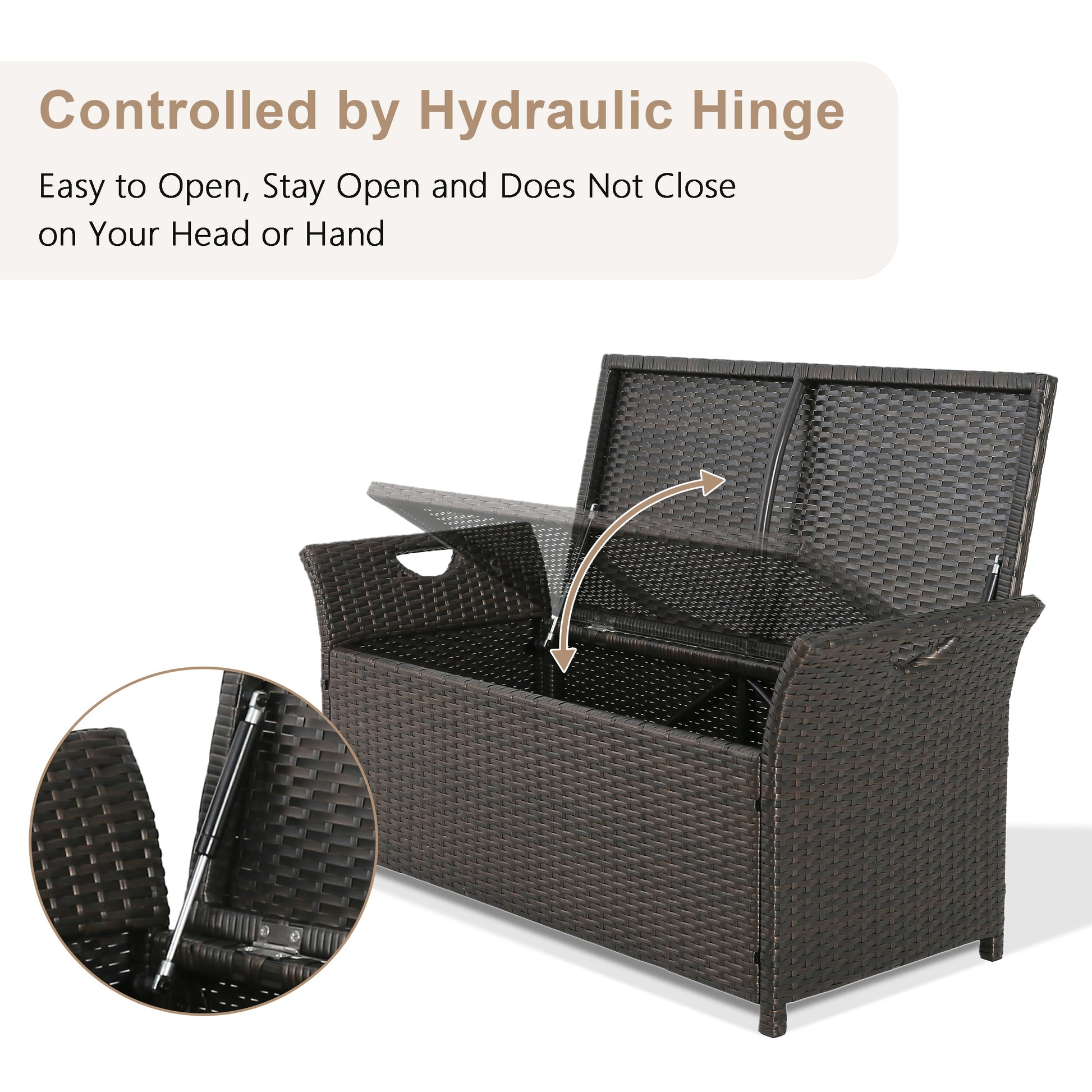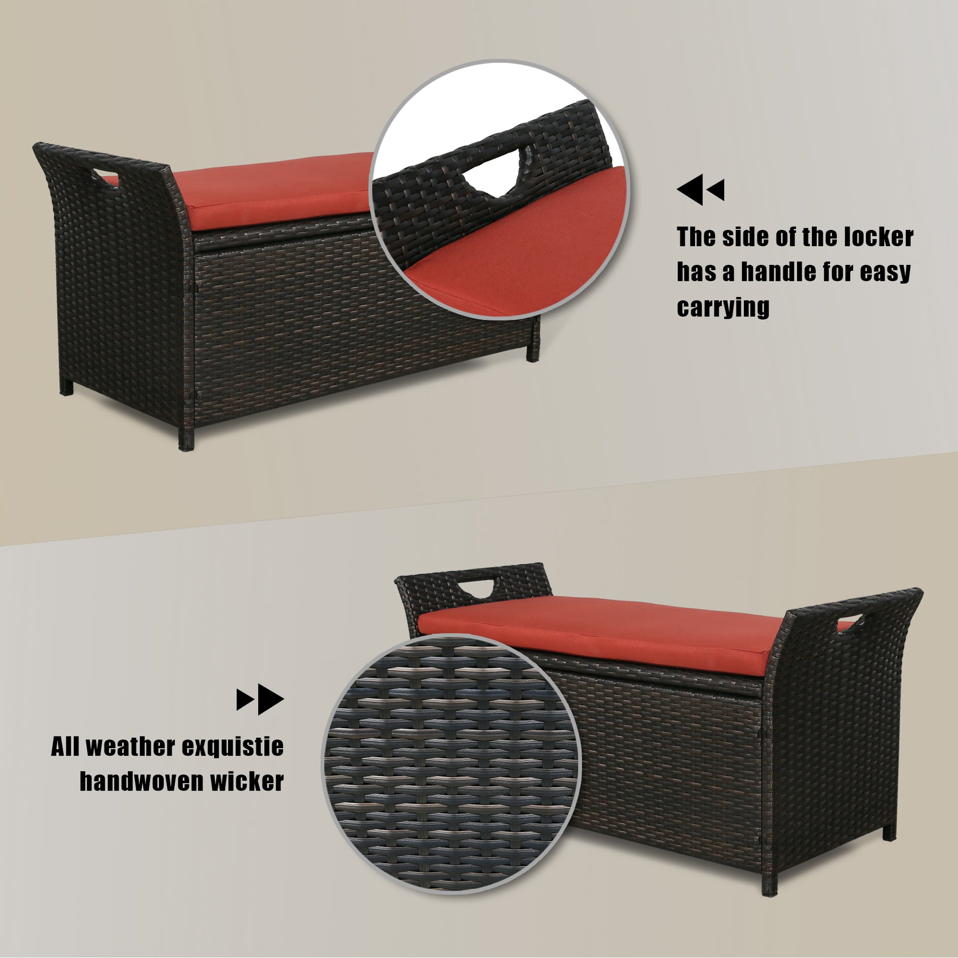 This elegantly designed outdoor storage bench can be a practical spacious storage bin as well as extra seating in your patio, poolside or living room. Simple yet contemporary design makes it a valuable piece to your patio furniture collection. High quality hand-woven rattan and special fabric cushion ensure this storage bin durable and long lasting. With our pneumatic support system, the lid opens smoothly and closes securely. Stylish and classic design fits in all decor styles and can be used both indoor and outdoor. Approximately 27.6 US gallons, perfect storage compartment for cushions, pillows, furniture covers, garden tools, toys, etc.